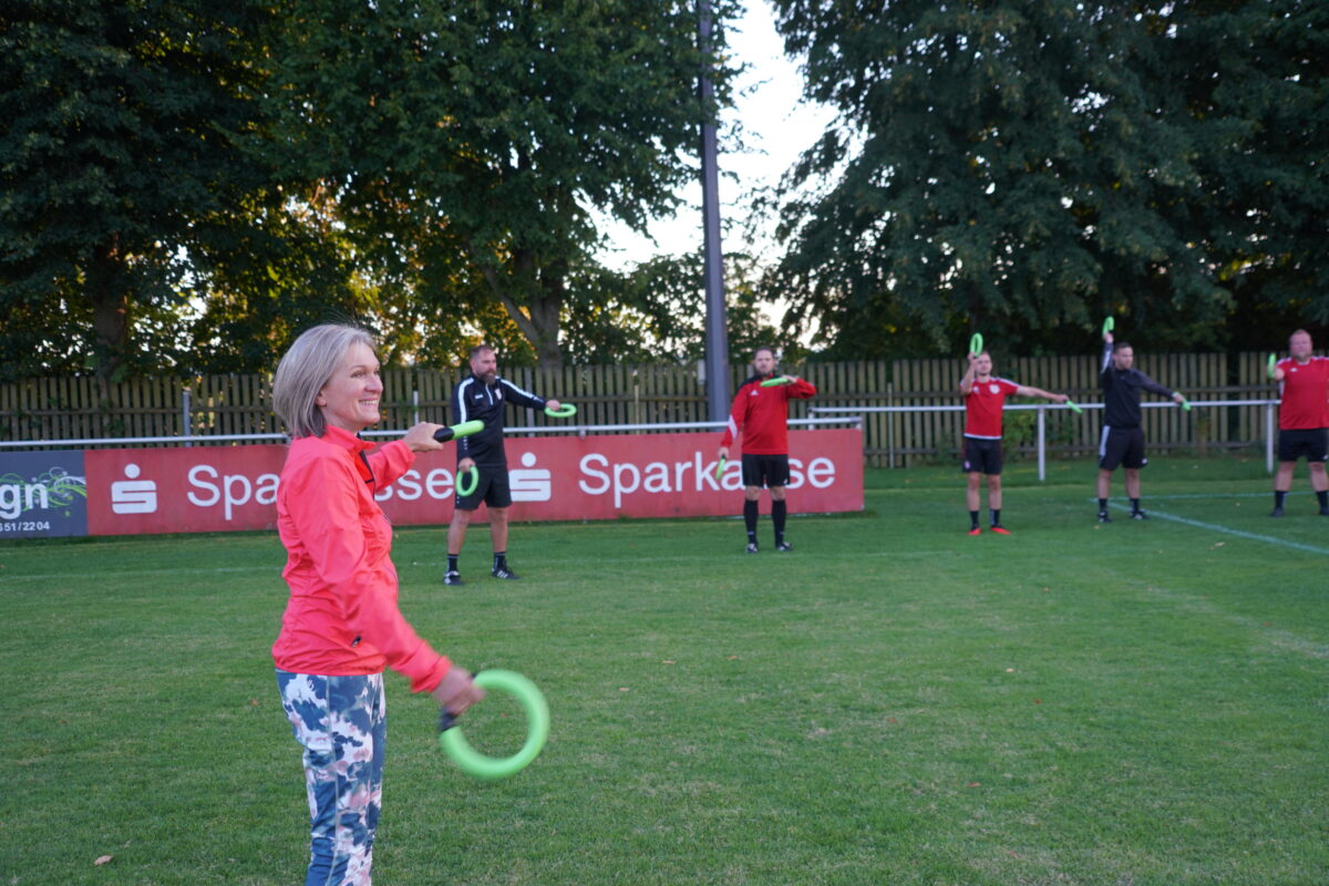 Am FSV Sportgelände kamen die Smovey-Ringe, gerippte Kunststoffringe, in deren Innerem sich vier Stahlkugeln bewegen, zum Einsatz. Beim Schwingen erzeugen sie hör- und spürbare Vibrationen, die den gesamten Körper stimulieren.