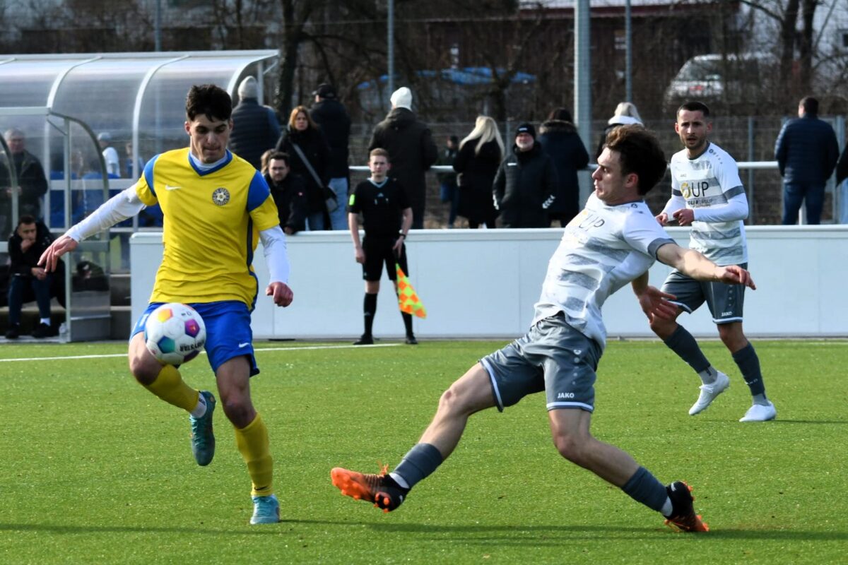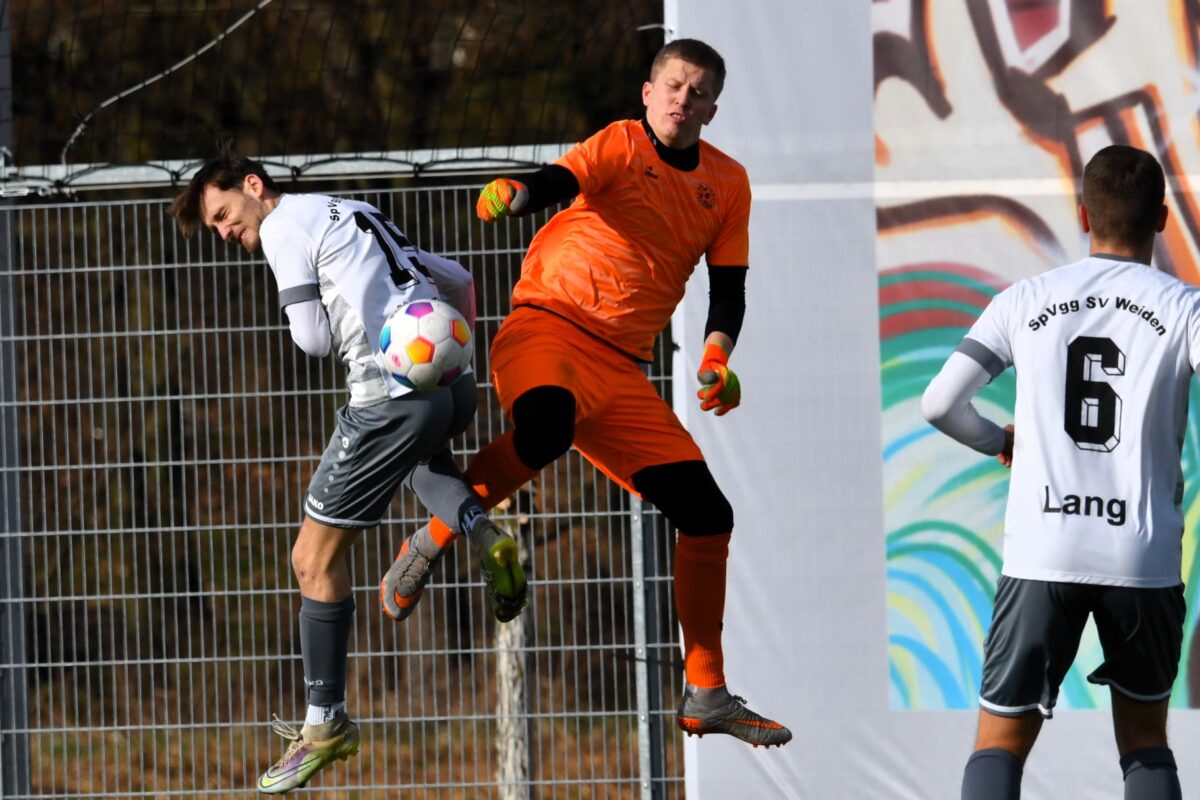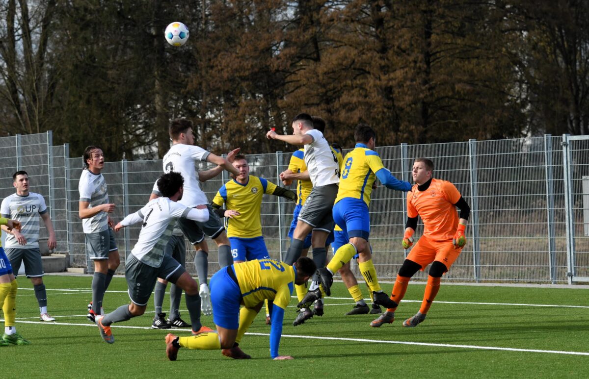 Rund 55 Zuschauer sehen auf dem Kunstrasenplatz der SpVgg eine flotte Partie. Von der ersten Minute an setzen die Riester-Schützlinge ihren Gegner unter Druck. Schon nach neun Minuten köpft Neuzugang Adrian Hoti zum 1:0 ein. Auch in der Folge hat der tschechische Schlussmann jede Menge zu tun.