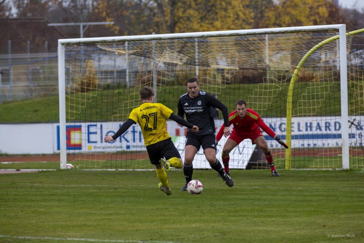 Bereits vor der Pause verschossen die Akteure auf dem Platz ihr Pulver und es fielen alle Treffer der Partie. Nach nur 60 Sekunden erzielte Erik Dulik (1.) die Führung für den Gastgeber. Ein Eigentor von Florian Grabinger (10.) brachte den Gästen den Ausgleich, der aber wiederum nur eine Minute hielt, weil Komlanvi Agbeve (11.) Amberg wieder in Führung brachte. Kurz vor der Pause schoss David Hofmeister (42.) das 2:2. Dabei blieb es, auch wenn in den zweiten intensiven 45 Minuten beide Teams auf den Siegtreffer spielten.