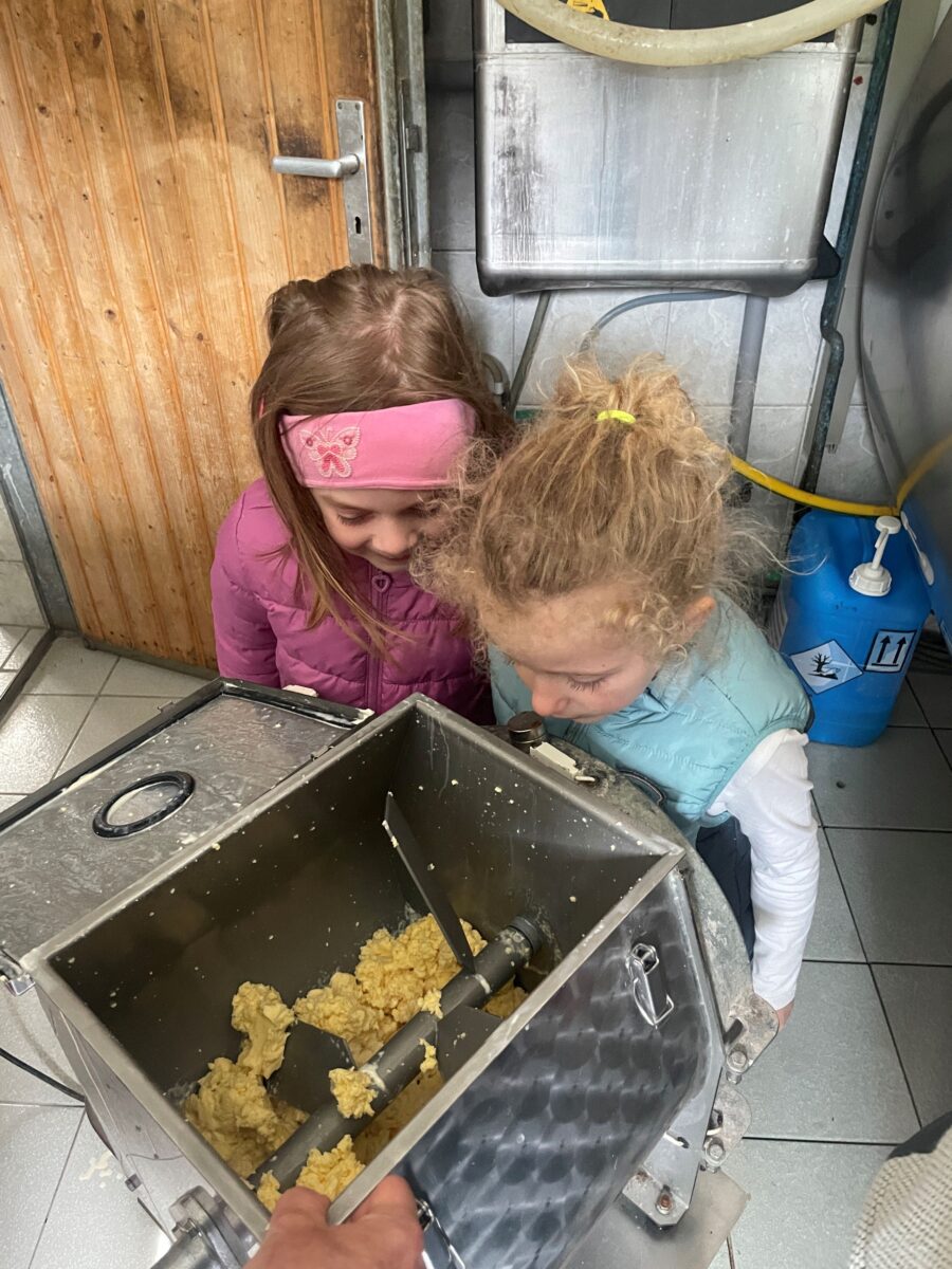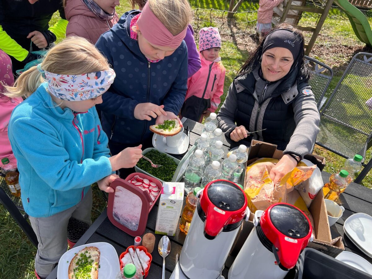 Im Mittelpunkt des Nachmittags stand das traditionelle Ausbuttern. Bäuerin Martina erklärte genau, wie aus Milch die leckere Butter wird, die anschließend von allen probiert werden durfte. Die Kinder genossen frisches Butterbrot mit Schnittlauch und Radieschen. Währenddessen konnten die Erwachsenen Kaffee und selbstgemachten Kuchen genießen und den Frühlingstag auskosten.