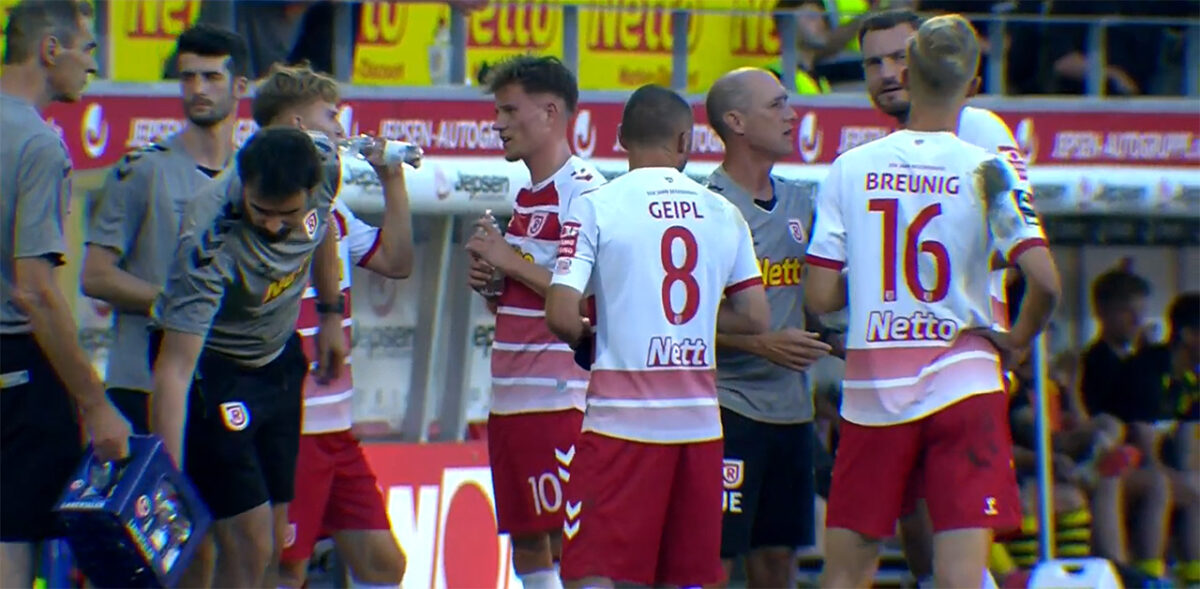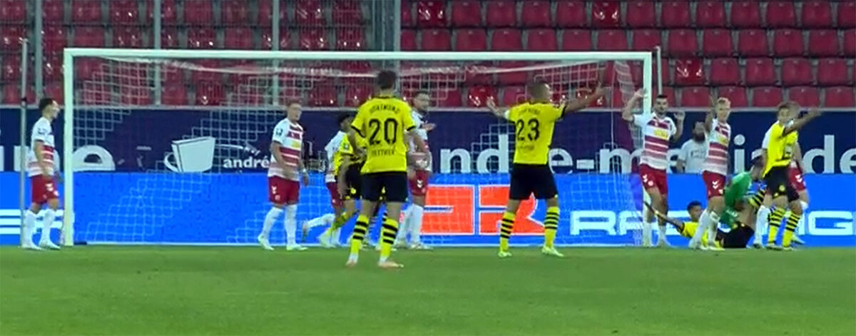 Das gilt mindestens im gleichen Maß für die Gäste, die mit Jermain Nischalkes Pfostenschuss (63.) – was für ein Name für einen Dortmunder! –, den Jahn-Keeper Felix Gebhardt an ebendiesen lenkte, Julian Hettwers brasilianischem Dribbling bis zur Torlinie (74.) und einem ausgebliebenen Elfmeterpfiff nach Fremdstriptease an Nischalke (85.) sogar noch näher am Dreier waren als der Jahn. An dieser Stelle kann man nur inständig an das – Achtung, Kompliment! – Kampfschwein Rasim Bulic appellieren, seine Judo-Griffe in Zaum zu halten. Mit VR wäre das heute nicht ohne Videobeweis und den Fingerzeig auf den Punkt über die Bühne gegangen.