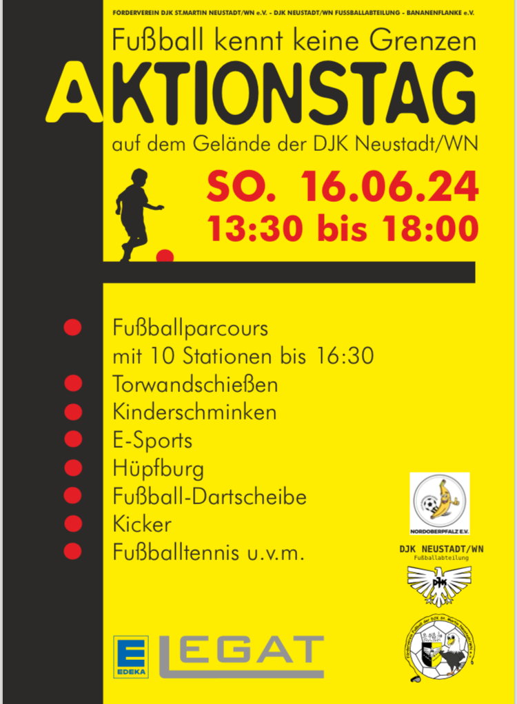 Zusammen mit dem Förderverein DJK St. Martin, Edeka Legat und Bananenflanke e. V. veranstaltet die DJK Neustadt/WN Einen Aktionstag für Groß und Klein. Unter dem Motto „Fußball kennt keine Grenzen“ geht es von 13.30 bis 18 Uhr um den schönsten Freizeitsport der Deutschen. Dazu wird ein Fußballparcours bis 16.30 Uhr aufgebaut, an dem sich alle gegeneinander messen können.