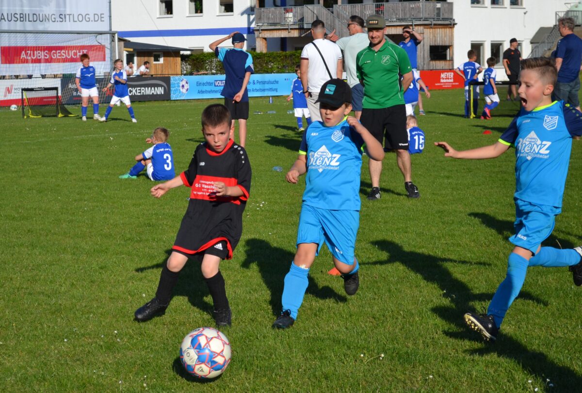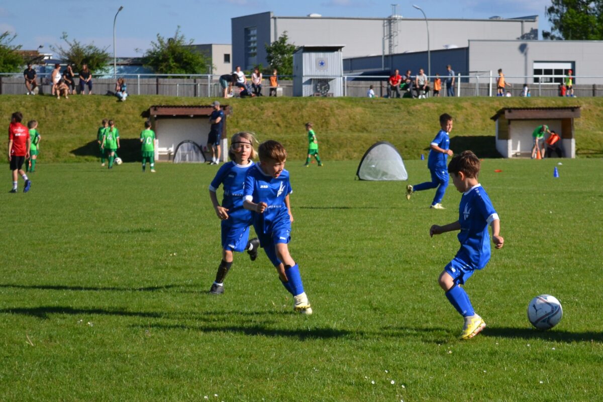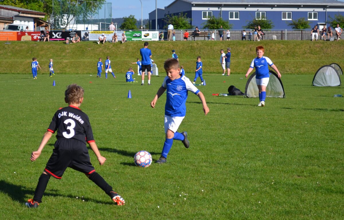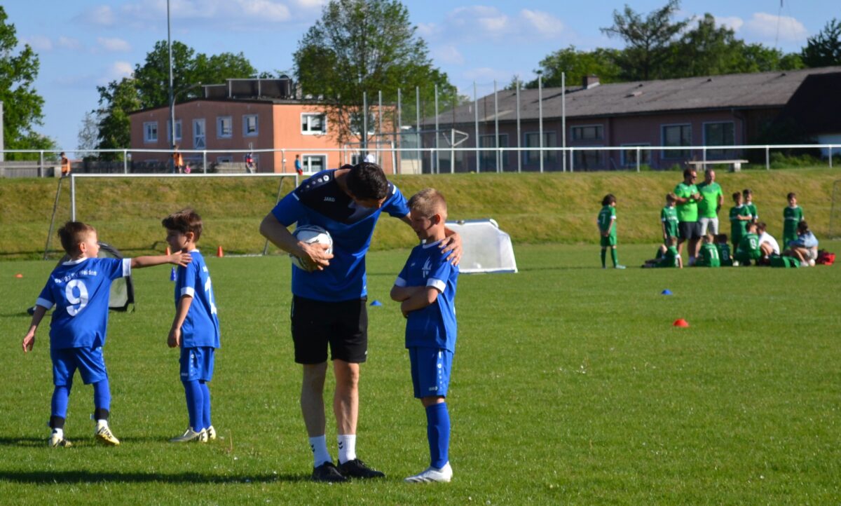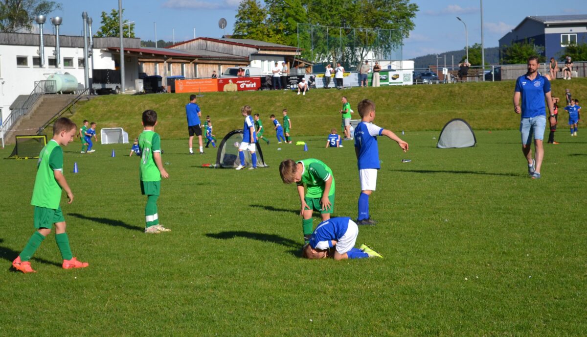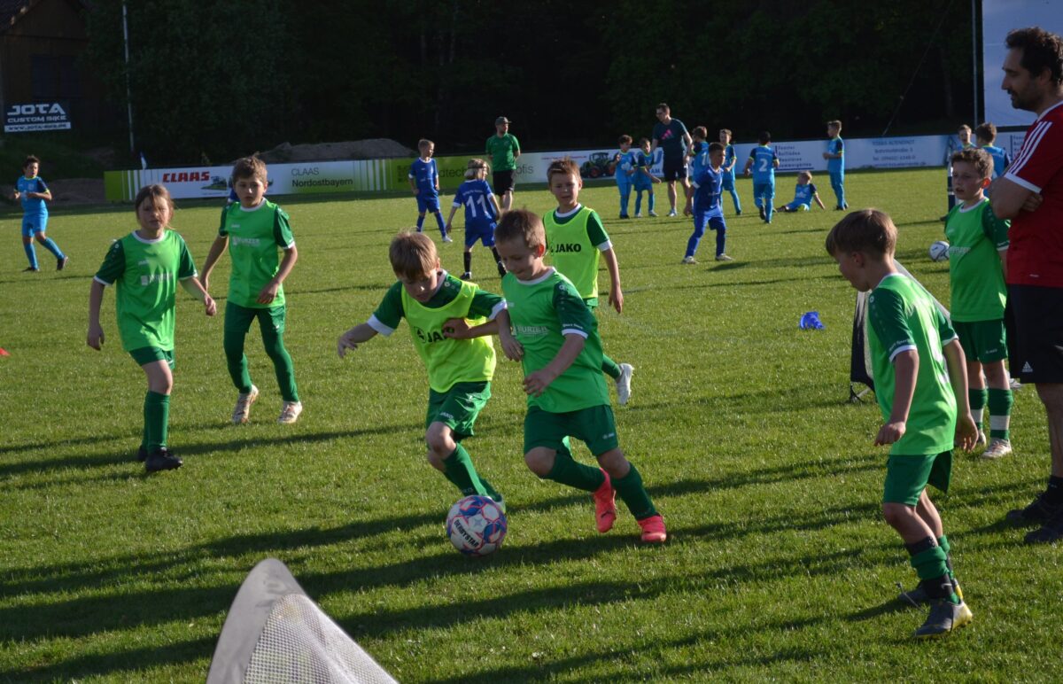 Man spürt die Begeisterung der Kids, mit der sie dabei sind an diesem frühen Montagabend. Manchmal mischt sich auch ein bisschen Enttäuschung drunter – über eine vergebene Chance, weil man mit einem Gegenspieler zusammen gerasselt ist, oder weil der Trainer gefühlt zu wenig Spielzeit gewährt hat. Doch schnell wird das eine oder andere Tränchen verdrückt und schon geht es weiter mit der Jagd auf den Ball. David, 9 Jahre, von der SG SV Altenstadt/SV Parkstein, ist einer der kickenden Kids. Die Antwort des Florian Wirtz– und Harry Kane-Fans auf die Frage, was ihm besonders gefällt, beweist, dass der Minifußball angekommen ist bei den kleinen Fußballern: „Mir gefällt besonders, dass ich mit der Mannschaft spielen und Tore schießen kann.“ Sein Teamkollege Simon, Fan von Wirtz und Can Uzun, bestätigt das: „Zusammen mit meinen Kumpels kicken, ist am besten. Fußball ist einfach das Schönste.“
