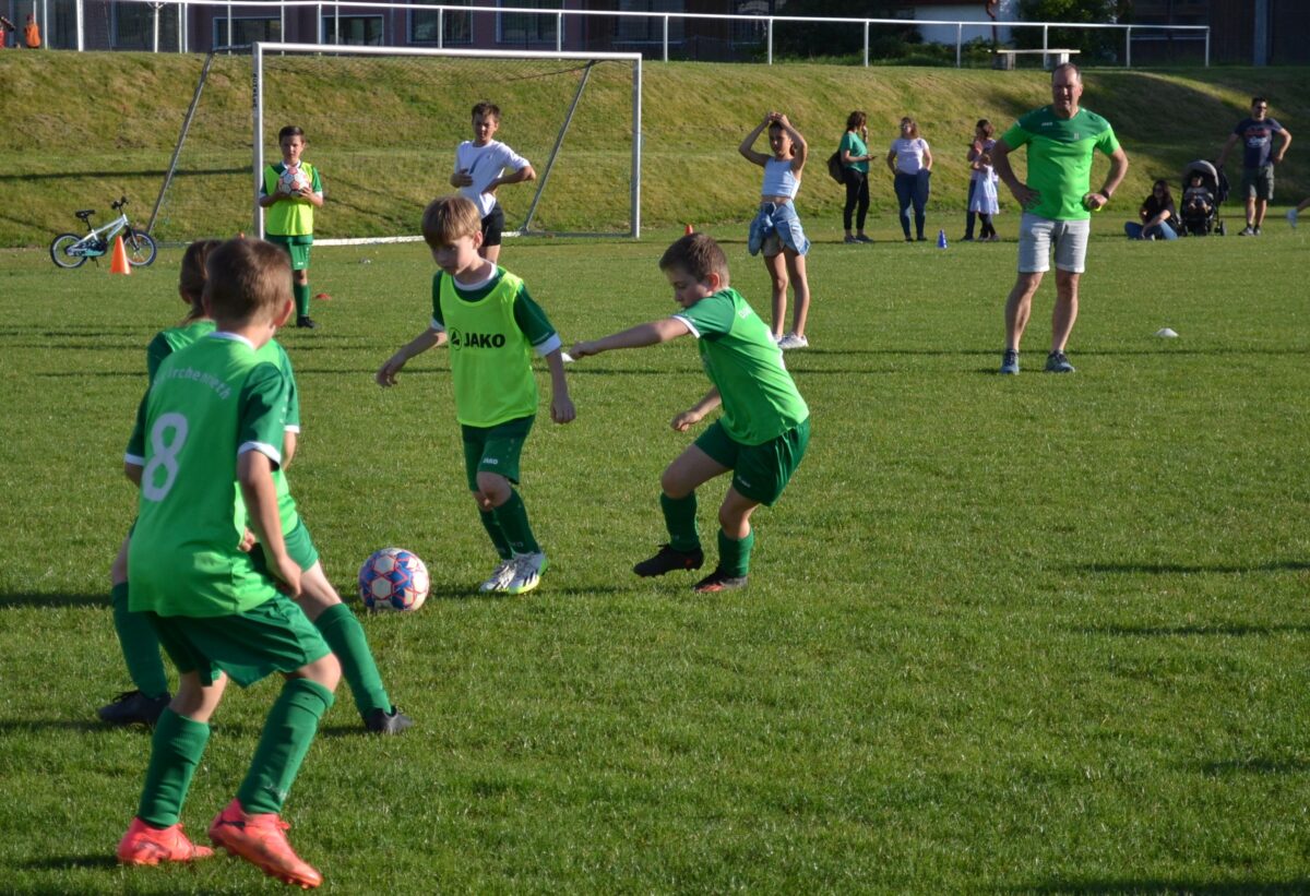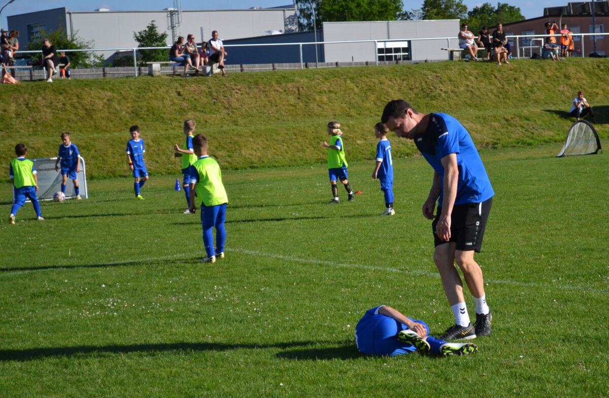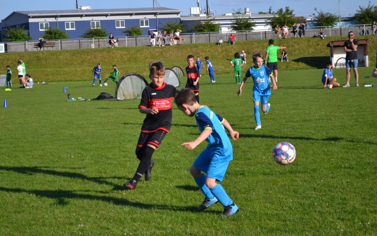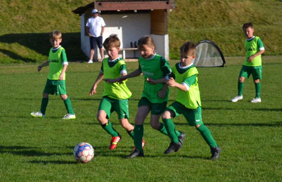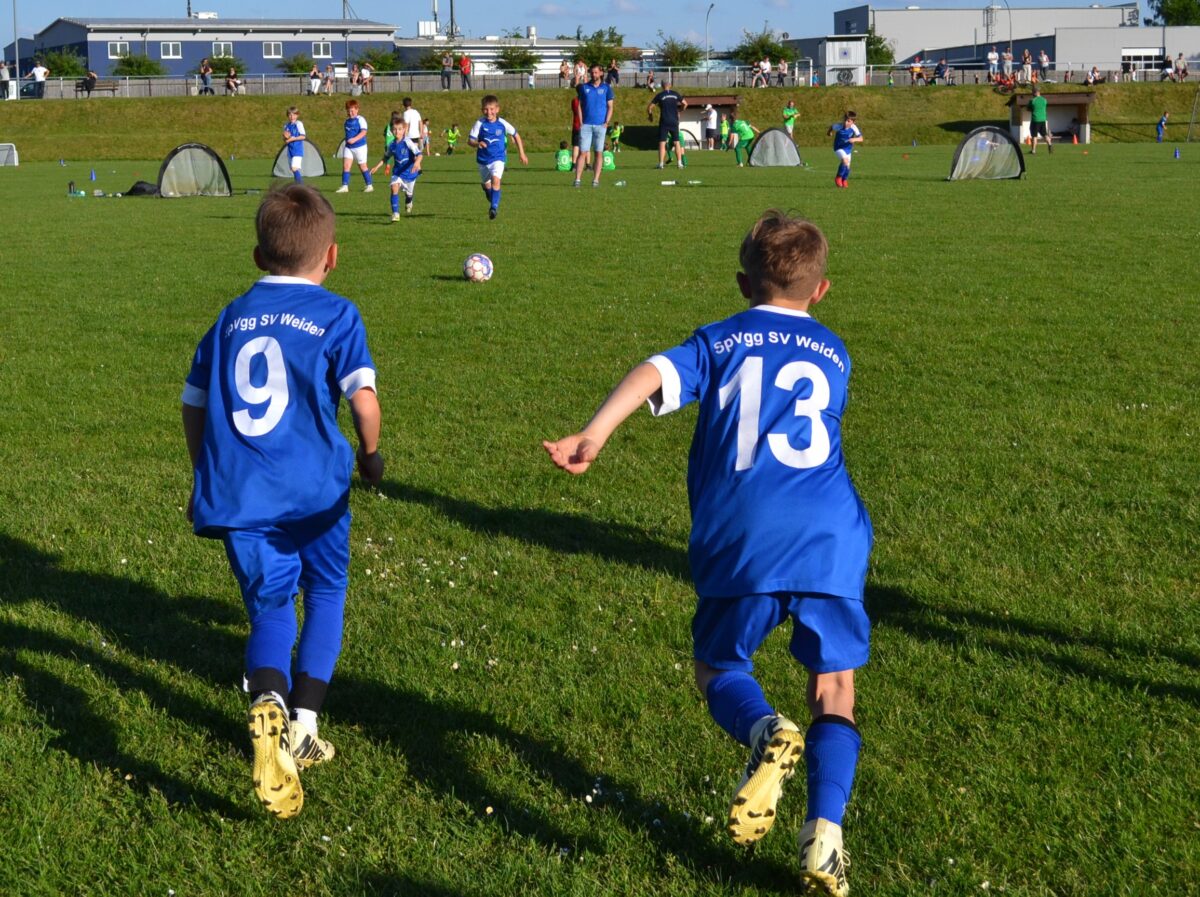 Man spürt die Begeisterung der Kids, mit der sie dabei sind an diesem frühen Montagabend. Manchmal mischt sich auch ein bisschen Enttäuschung drunter – über eine vergebene Chance, weil man mit einem Gegenspieler zusammen gerasselt ist, oder weil der Trainer gefühlt zu wenig Spielzeit gewährt hat. Doch schnell wird das eine oder andere Tränchen verdrückt und schon geht es weiter mit der Jagd auf den Ball. David, 9 Jahre, von der SG SV Altenstadt/SV Parkstein, ist einer der kickenden Kids. Die Antwort des Florian Wirtz– und Harry Kane-Fans auf die Frage, was ihm besonders gefällt, beweist, dass der Minifußball angekommen ist bei den kleinen Fußballern: „Mir gefällt besonders, dass ich mit der Mannschaft spielen und Tore schießen kann.“ Sein Teamkollege Simon, Fan von Wirtz und Can Uzun, bestätigt das: „Zusammen mit meinen Kumpels kicken, ist am besten. Fußball ist einfach das Schönste.“