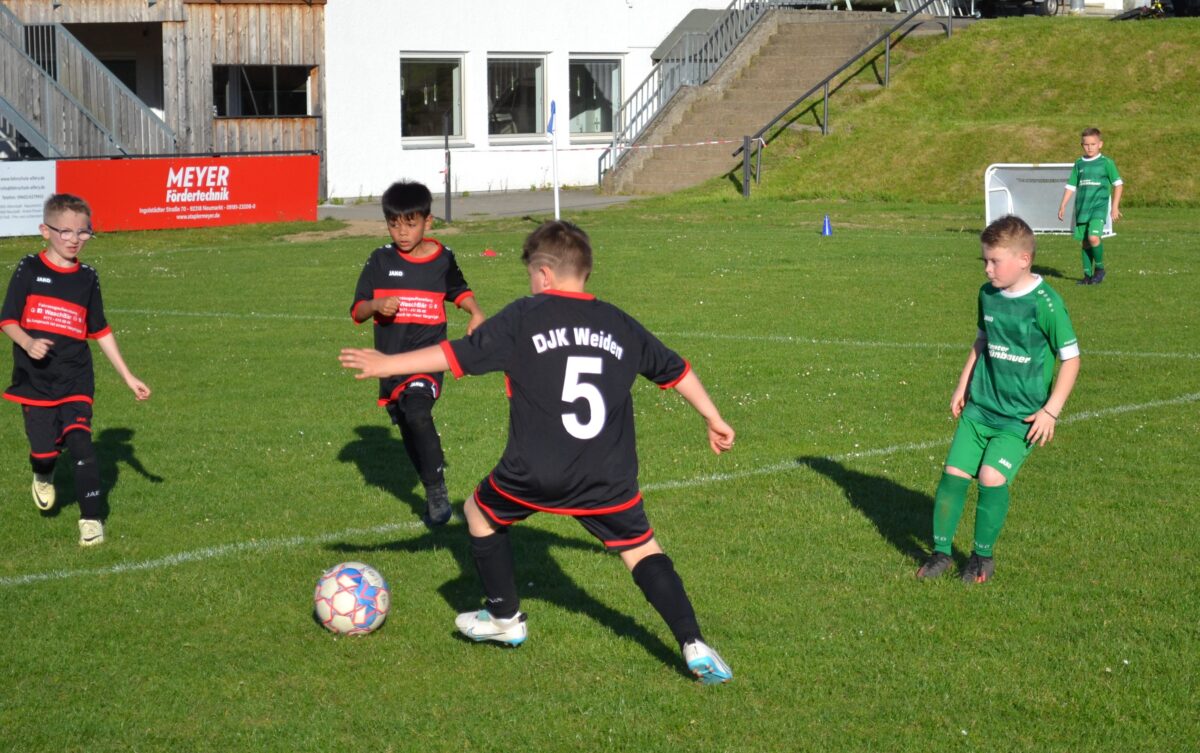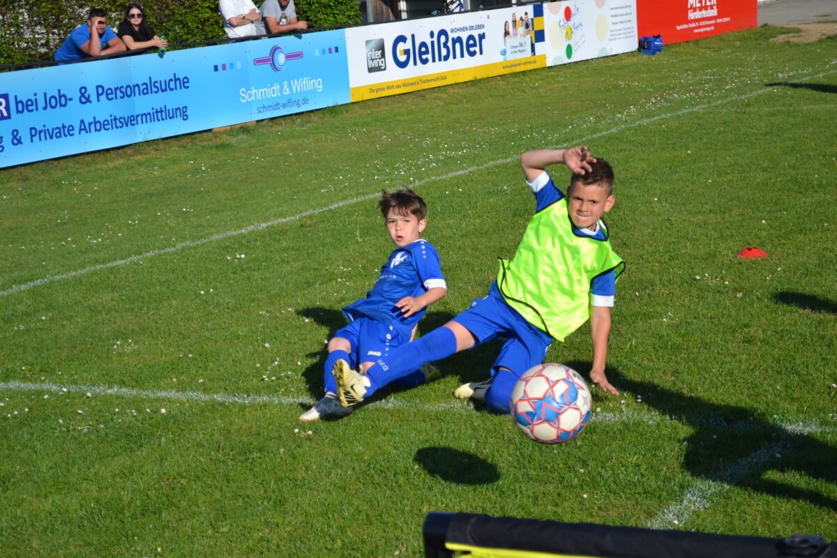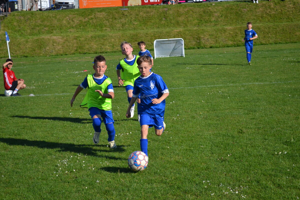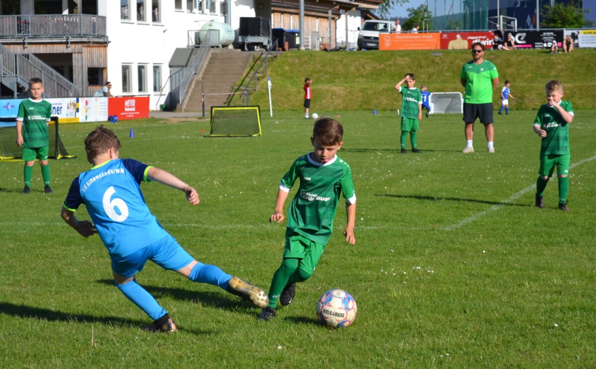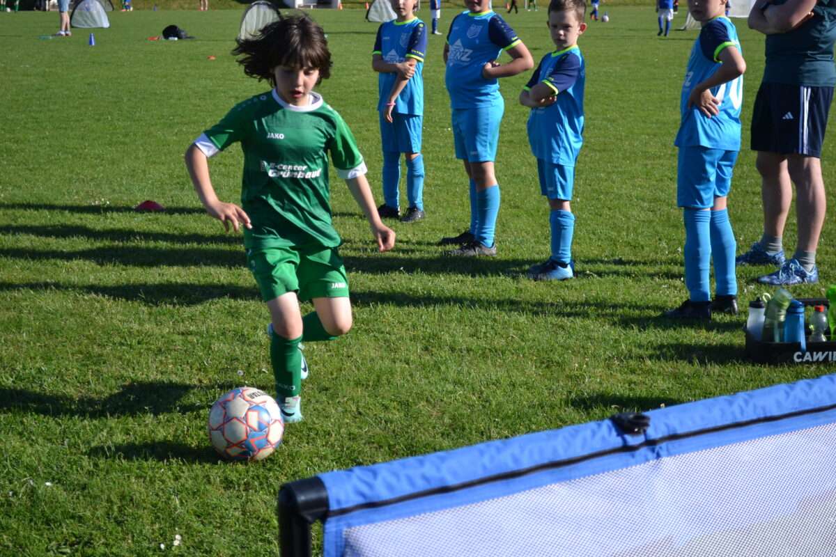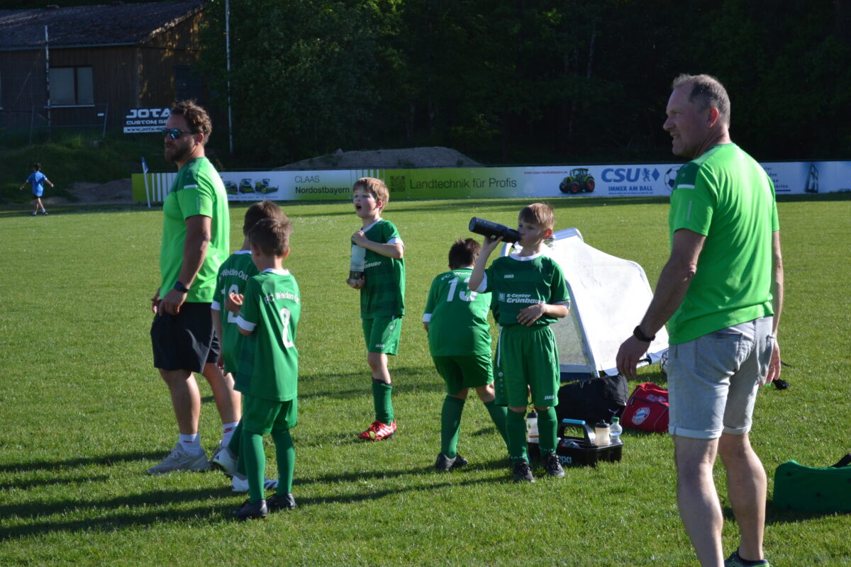 Man spürt die Begeisterung der Kids, mit der sie dabei sind an diesem frühen Montagabend. Manchmal mischt sich auch ein bisschen Enttäuschung drunter – über eine vergebene Chance, weil man mit einem Gegenspieler zusammen gerasselt ist, oder weil der Trainer gefühlt zu wenig Spielzeit gewährt hat. Doch schnell wird das eine oder andere Tränchen verdrückt und schon geht es weiter mit der Jagd auf den Ball. David, 9 Jahre, von der SG SV Altenstadt/SV Parkstein, ist einer der kickenden Kids. Die Antwort des Florian Wirtz– und Harry Kane-Fans auf die Frage, was ihm besonders gefällt, beweist, dass der Minifußball angekommen ist bei den kleinen Fußballern: „Mir gefällt besonders, dass ich mit der Mannschaft spielen und Tore schießen kann.“ Sein Teamkollege Simon, Fan von Wirtz und Can Uzun, bestätigt das: „Zusammen mit meinen Kumpels kicken, ist am besten. Fußball ist einfach das Schönste.“