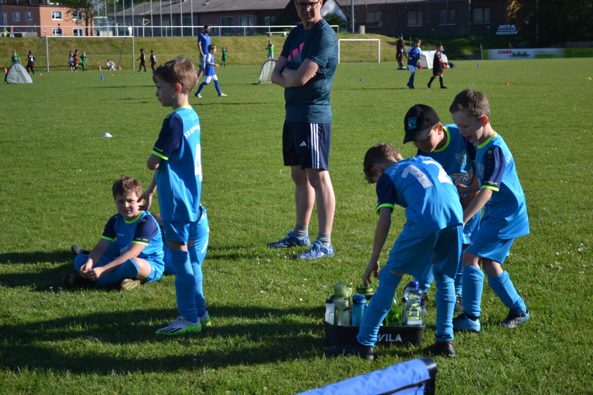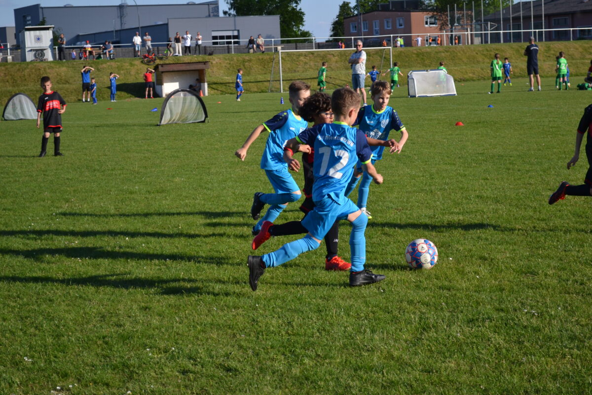 Gut eine Stunde geht es rund auf dem SV-Sportplatz: Auf sechs mit Hütchen eingegrenzten Mini-Spielfeldern jagen die kleinen Wirtz’ und Uzuns dem Leder nach und versuchen, es möglichst oft in den winzigen Toren ohne Keeper unterzubringen. Wohltuend: Kein Zuschauer-Geschrei von außen, die Betreuer greifen nur im Notfall und dann sehr zurückhaltend ein, keine Pöbeleien gegen den Schiedsrichter – auch, weil es gar keinen gibt beim Funino. Die Spieler regeln das untereinander – und es funktioniert problemlos.