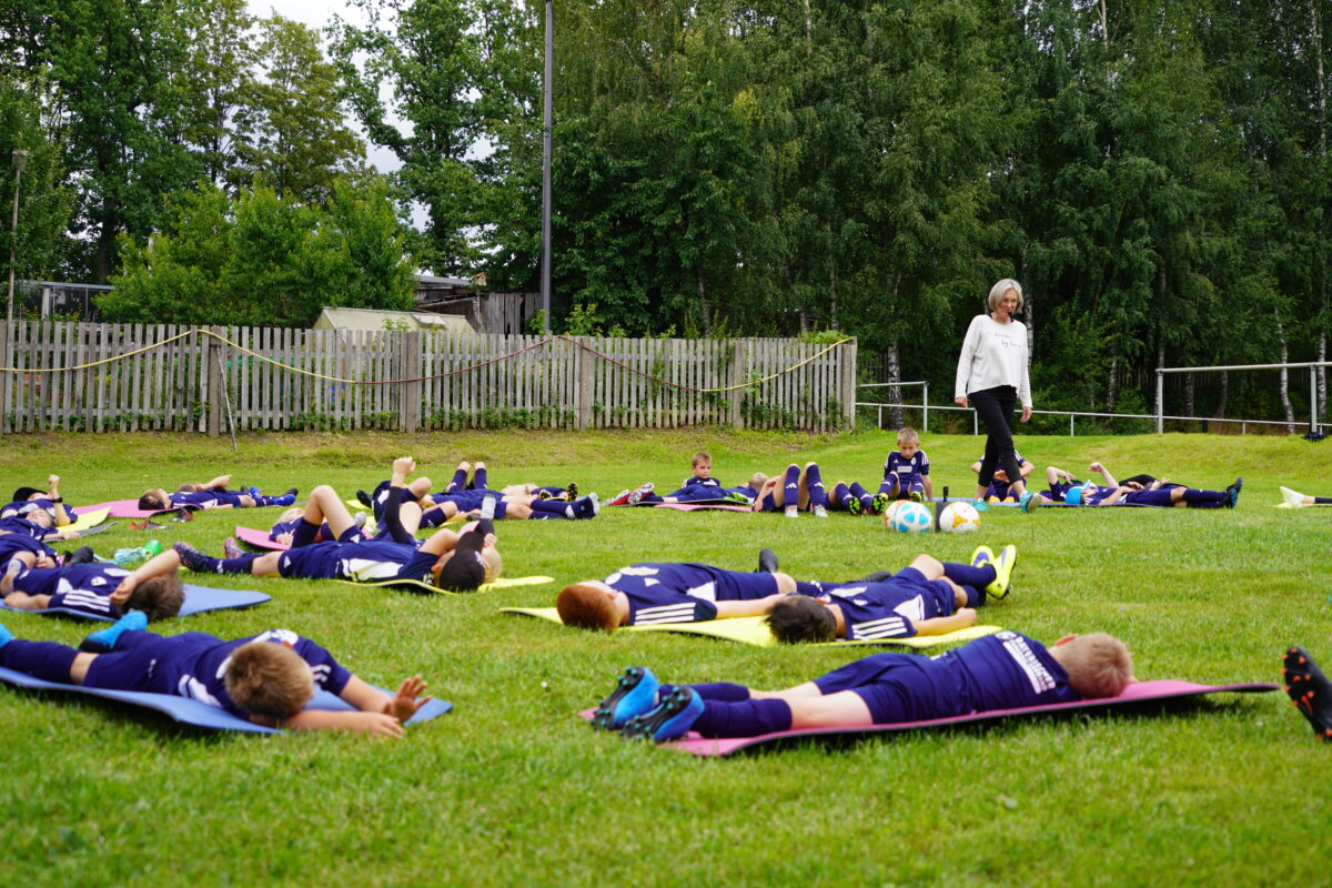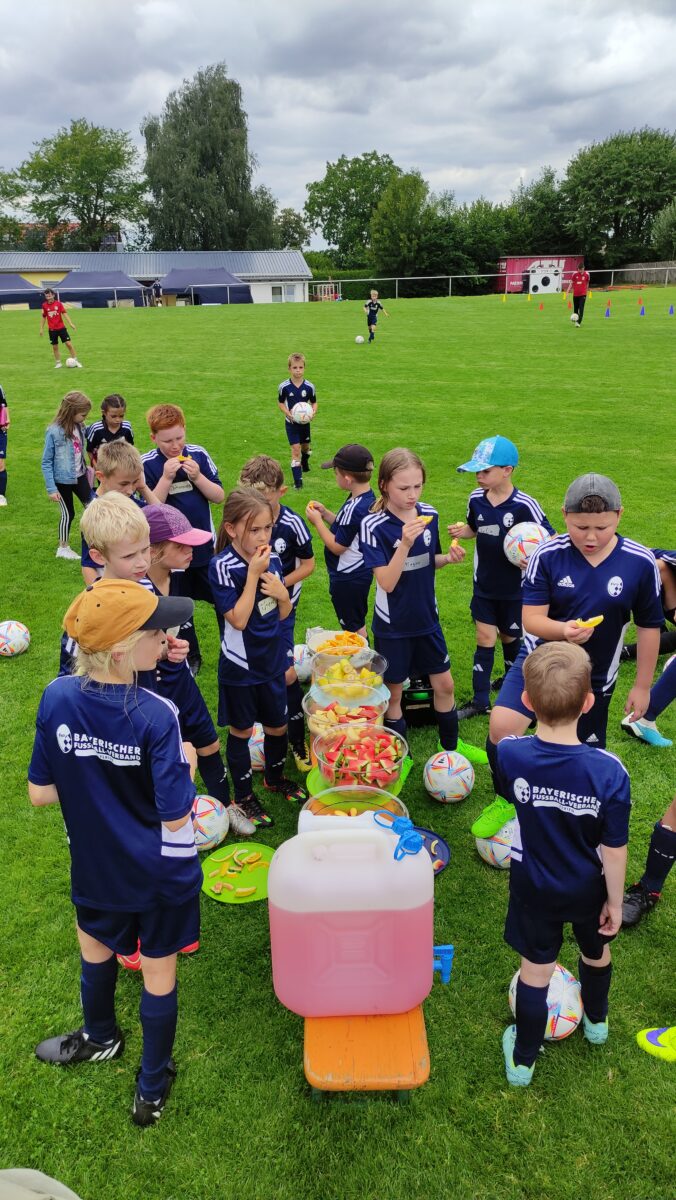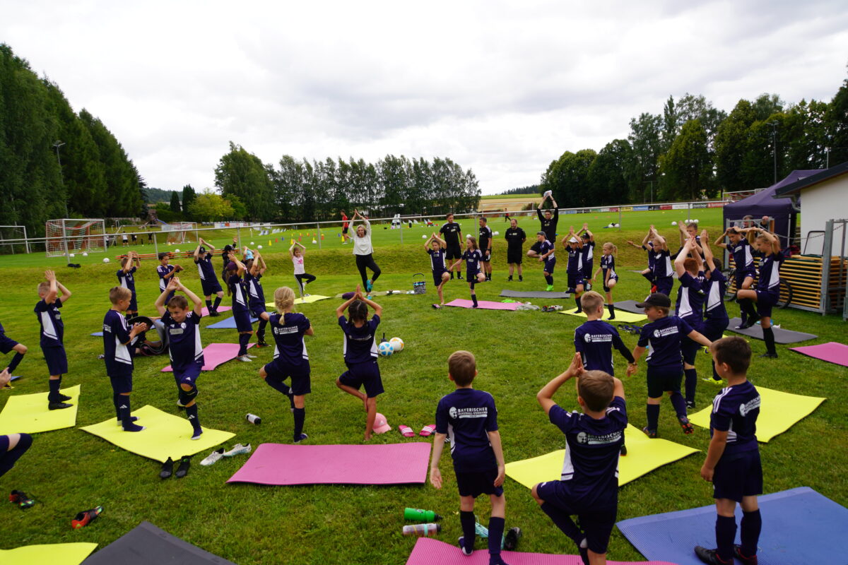 Die FSV’ler hatten an alles gedacht. Die jungen Kicker bekamen ein Frühstück, während des ganzen Tages Getränke und Obst. Norbert Schmid und Rainer Stark fungierten, unterstützt von einigen Spieler-Mamas, als Küchenteam. So gab es Penne mit Hackfleisch oder Tomatensoße, Putengeschnetzeltes oder Burger mit Salat und Pommes. Angesagt war natürlich in erster Linie Fußballtraining, es gab aber auch aktive Erholung. „Cool Down“ hieß es am ersten Tag nach dem Mittagessen. Die Entspannungsspezialistin Doris Völkl zeigte den jungen Fußballern, wie man sich mithilfe von einfachen und effektiven Entspannungstechniken schnell beruhigt, konzentriert und regeneriert. Ein Fußballquiz brachte dann die Köpfe zum Brummen.
