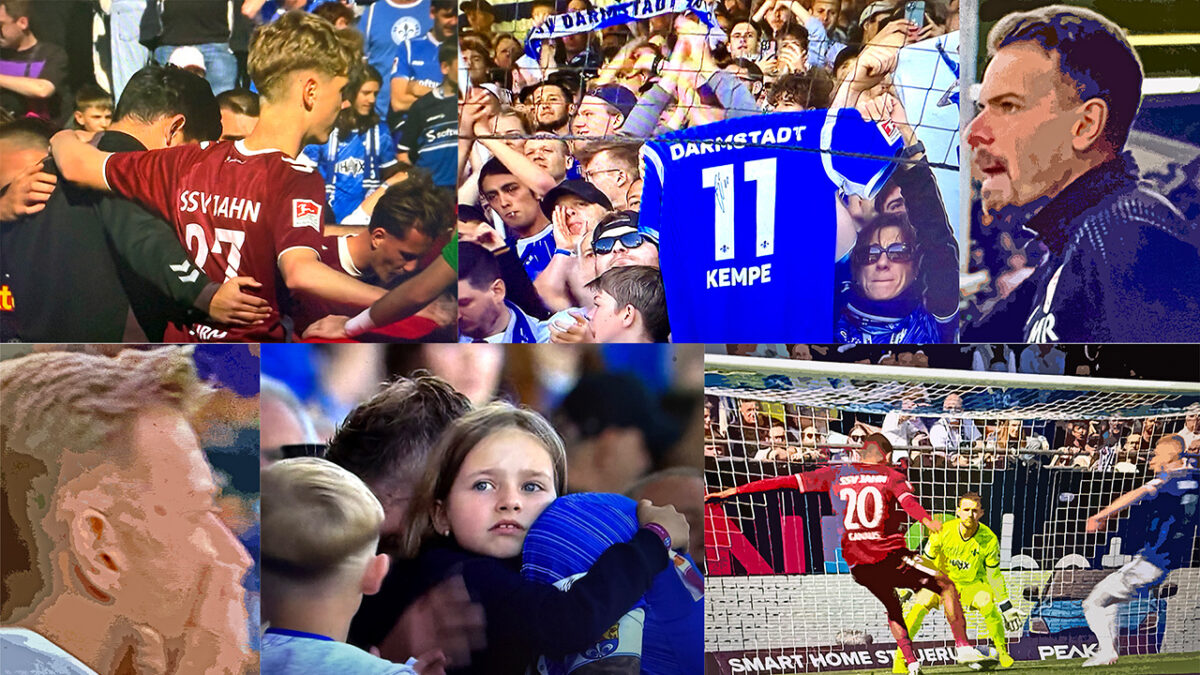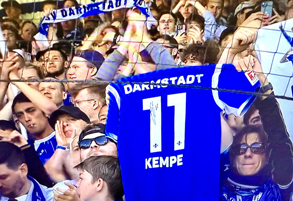 Nach einer guten Stunde hält das Stadion den Atem an: Tobias Kempe – Freistoß-Feinmechaniker, Aufstiegsheld, Lilien-Herz seit über einem Jahrzehnt – wird zum letzten Mal ausgewechselt. Mitspieler bilden Spalier, das Böllenfalltor steht. Kempe dreht eine Ehrenrunde, herzt, küsst und umarmt, was bei 3 nicht auf dem Stadiondach ist – besonders aber natürlich Frau und Familie im Publikum.