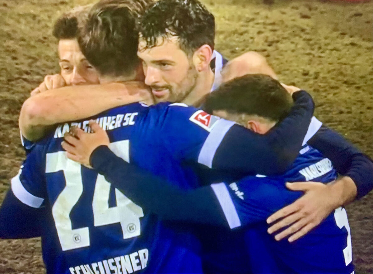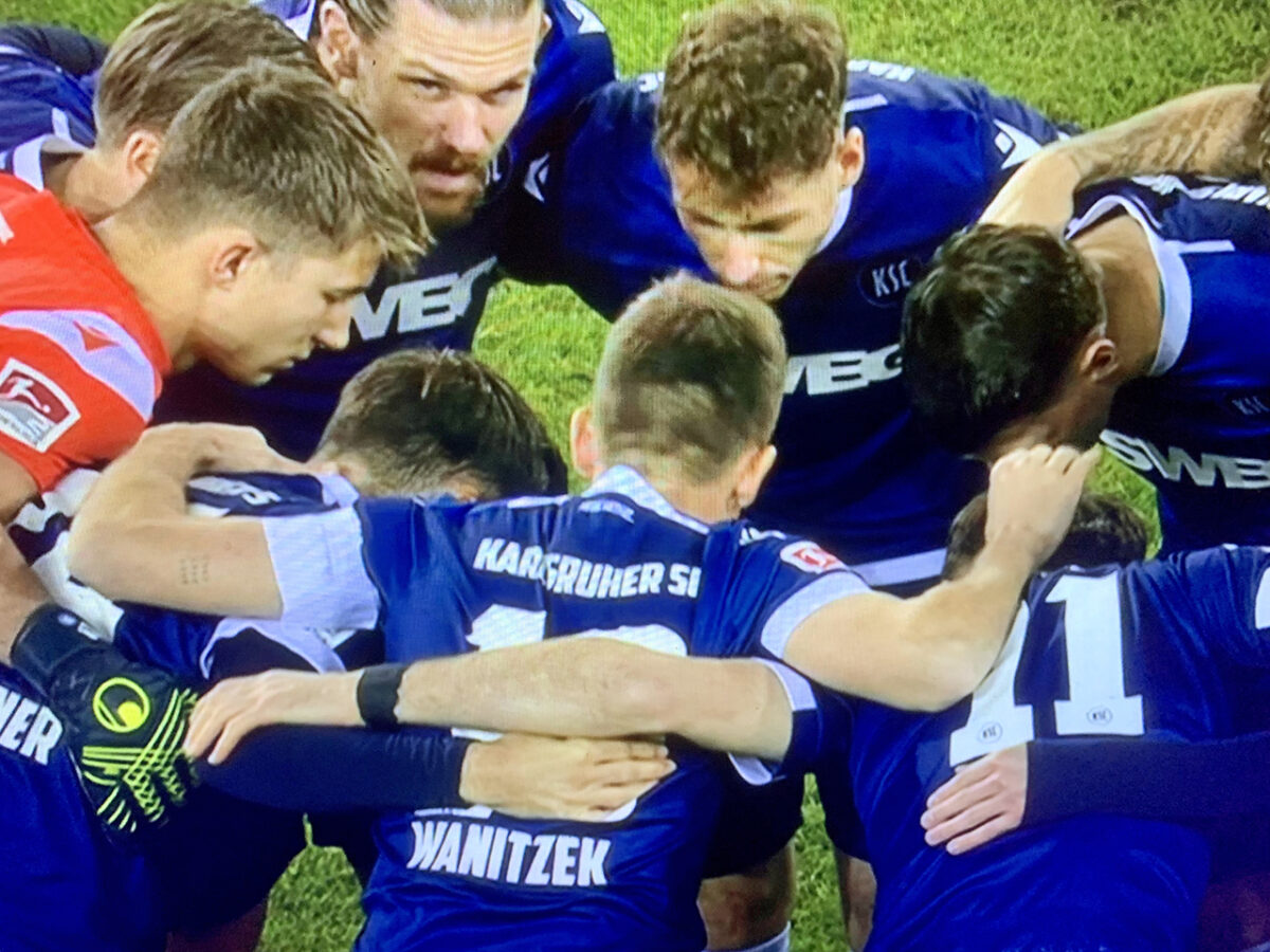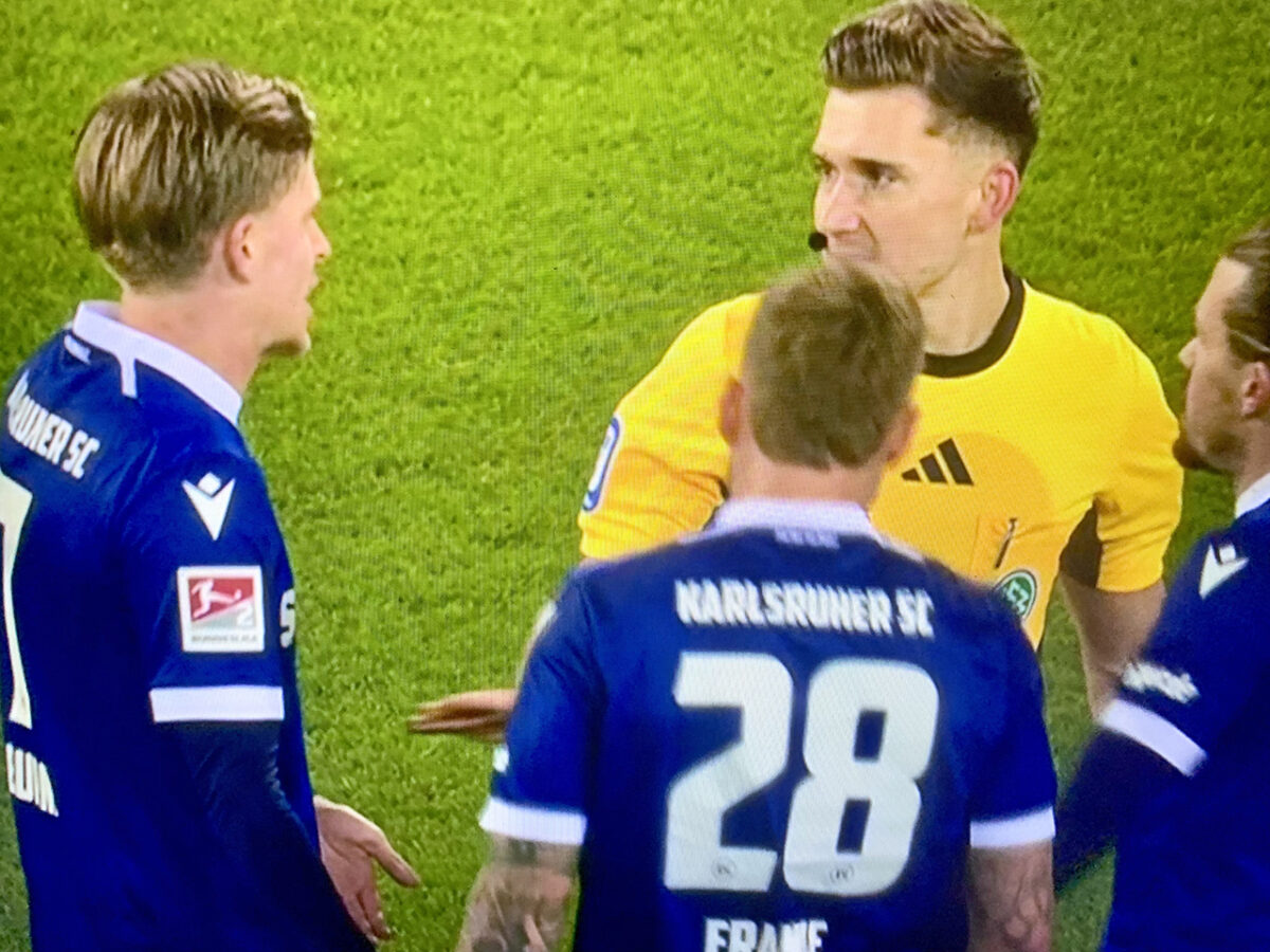 Und das hätte gegen einen ebenfalls verunsicherten Karlsruher SC durchaus für einen Erfolg reichen können, weil Christian Viet nach einer Flanke aus zwölf Metern Volley abzieht und Marcel Franke reflexartig den Arm hochreißt wie weiland der unselige Marc Cucurella. Schiri Felix Prigan zeigt auf den Punkt – Elias Huth zittert den Strafstoß Keeper Max Weiß in die Arme, aber Prigan lässt wiederholen, Weiß hat sich zu früh von der Linie bewegt (17.).