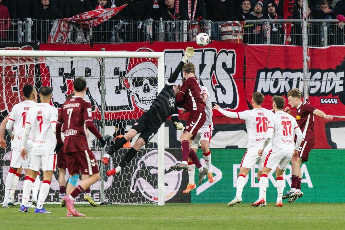 Anstatt die Verunsicherung zu nutzen, bringt Regensburg die Ruhrmetropole in Feierlaune. Es braucht ein Gastgeschenk von Felix Strauß, der sich die Essener Abwehrleistung zum Vorbild nimmt und beim Versuch eines Abwehr-Tiki-Taka seinerseits ohne Gegnerdruck eine Ecke anbietet – aus dem Standard dann im zweiten Anlauf der Ausgleich durch Lucas Brummes unhaltbaren Schuss aus 16 Metern ins linke Eck (33.).