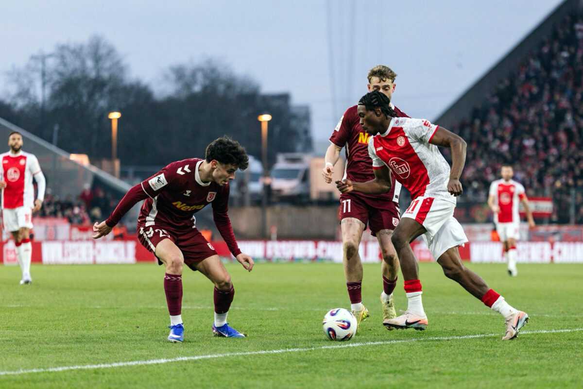 Die Hafenstraße zittert sich anschließend zu einem mehr als schmeichelhaften Dreier, weil auch Florian Dietz bei seinem erneuten Kurzeinsatz den Ball mit der Hacke aus drei Metern knapp über die Latte zirkelt (90.+4). Dass der ansonsten souveräne Schiedsrichter Felix Prigan, der viel laufen lässt und so diesem rasanten Schlagabtausch viel Raum bietet, trotz vieler Essener Kunstpausen an der Eckfahne pünktlich abpfeift, ist für die Regensburger wenig hilfreich.