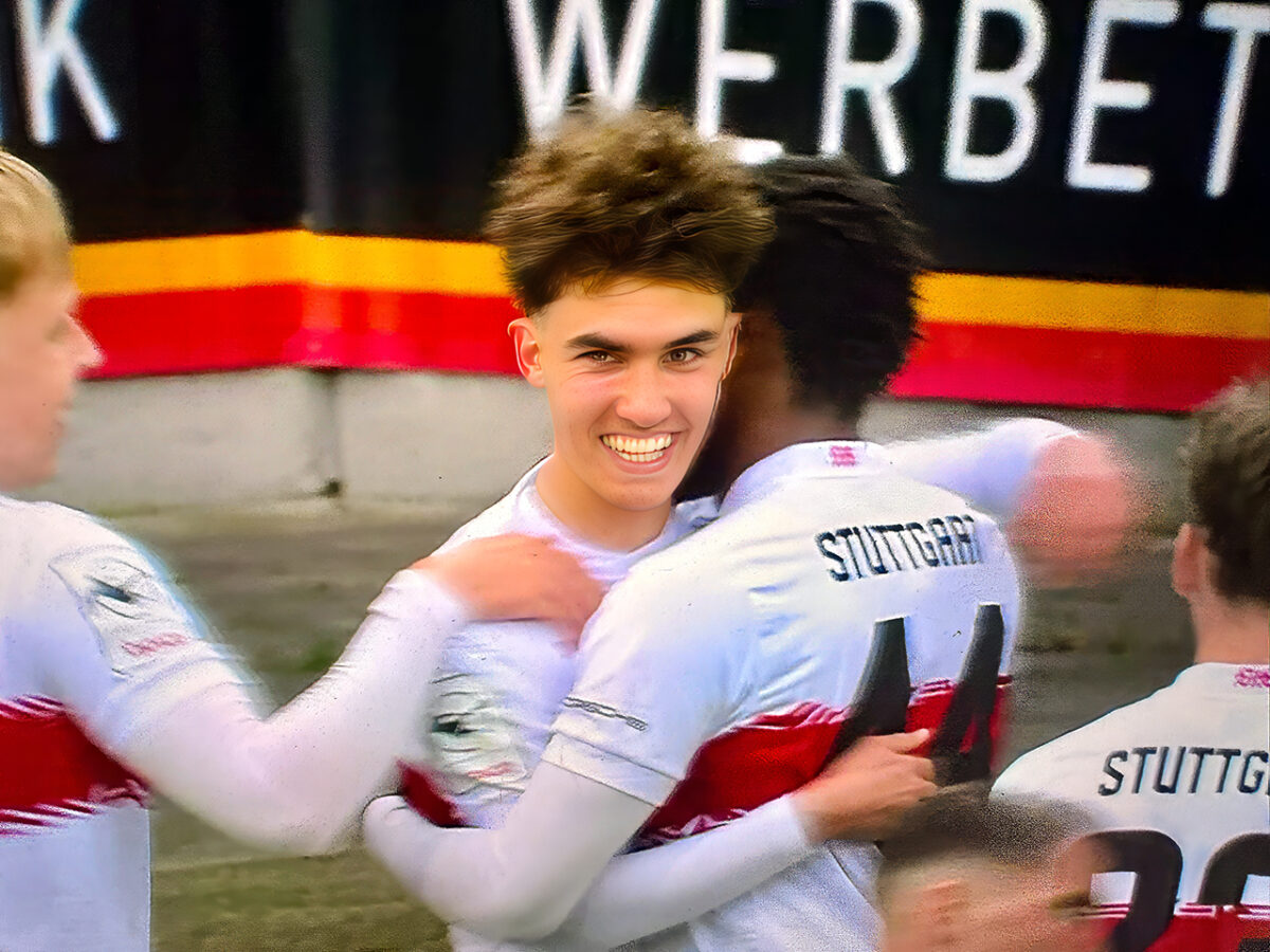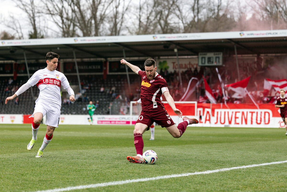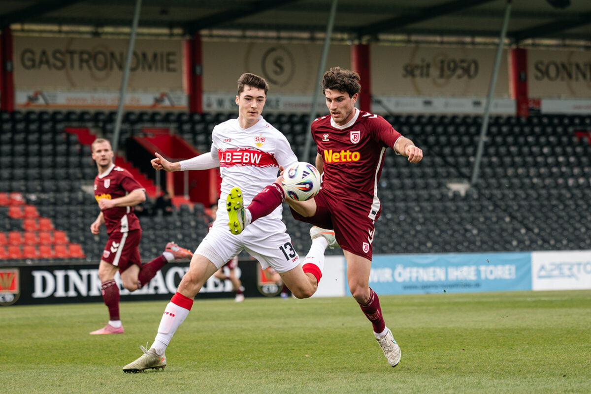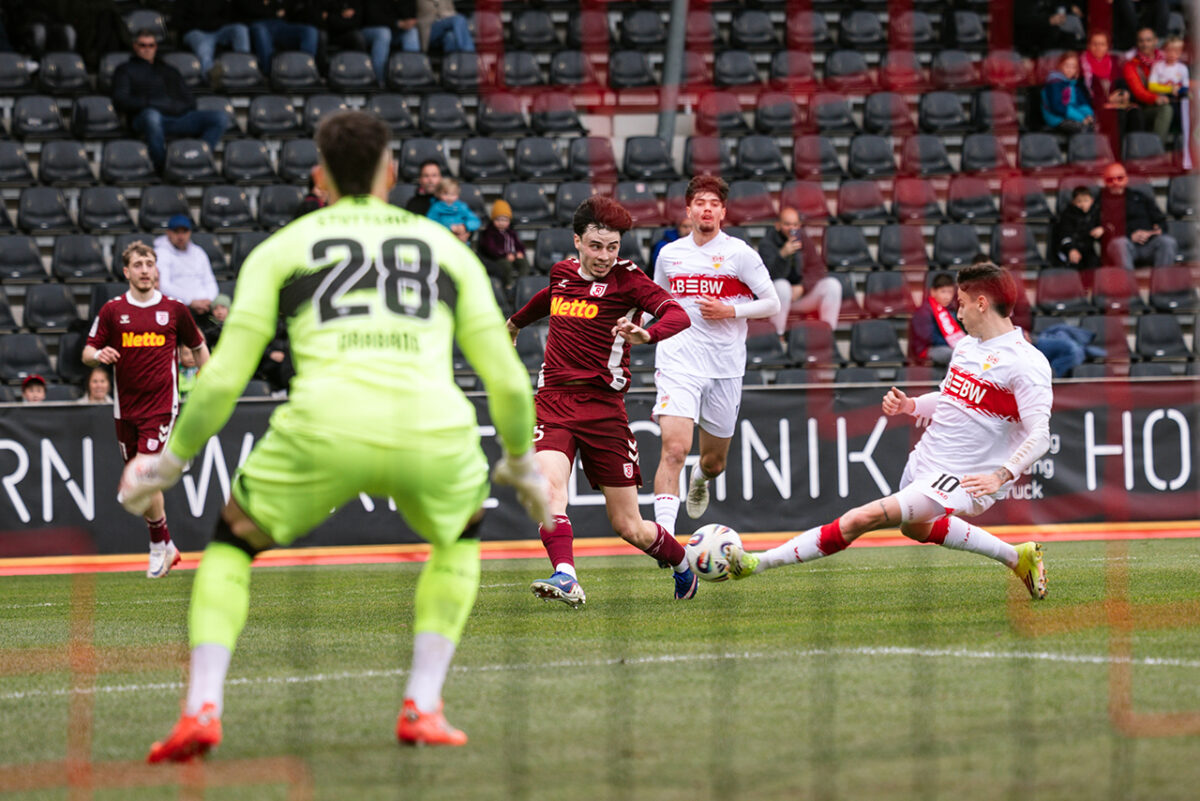 Dann die zweite Hälfte, ähnliches Bild, ausgeglichen, Stuttgart läuft alleine aufs Tor, wir laufen alleine aufs Tor, jeder hätte eigentlich in Führung gehen können. Und dann war es Noah Darvich, der alleine durch fünf Leute durchläuft und das Tor macht. So etwas kann immer mal passieren, eine Einzelaktion. Nur musst du dann den Kopf oben behalten, du darfst die Nerven nicht verlieren, du darfst einfach nicht so anrennen. Da sind wir viel zu überhastet und ungestüm, was ich der Mannschaft gar nicht vorwerfe, weil sie halt so ist. Sie will dann einfach unbedingt, sie hat einen tollen Willen.