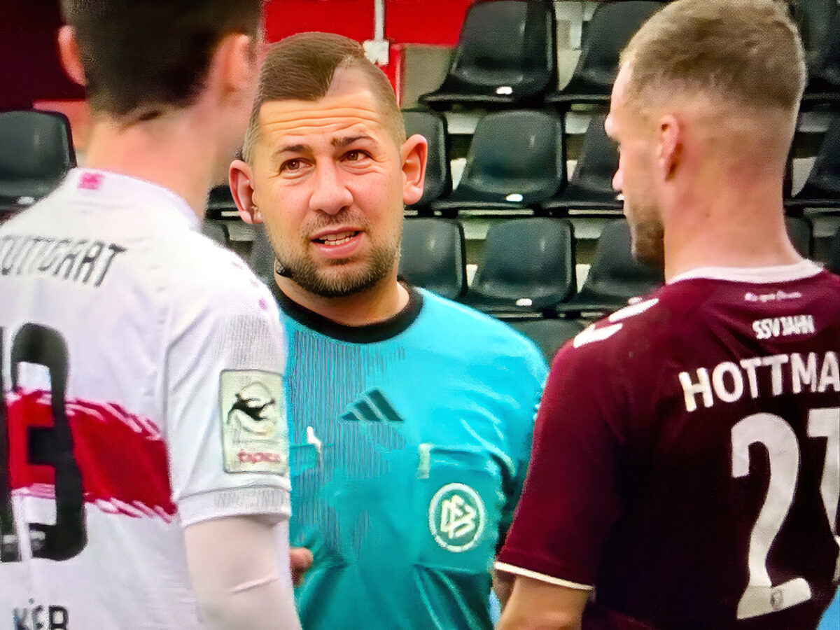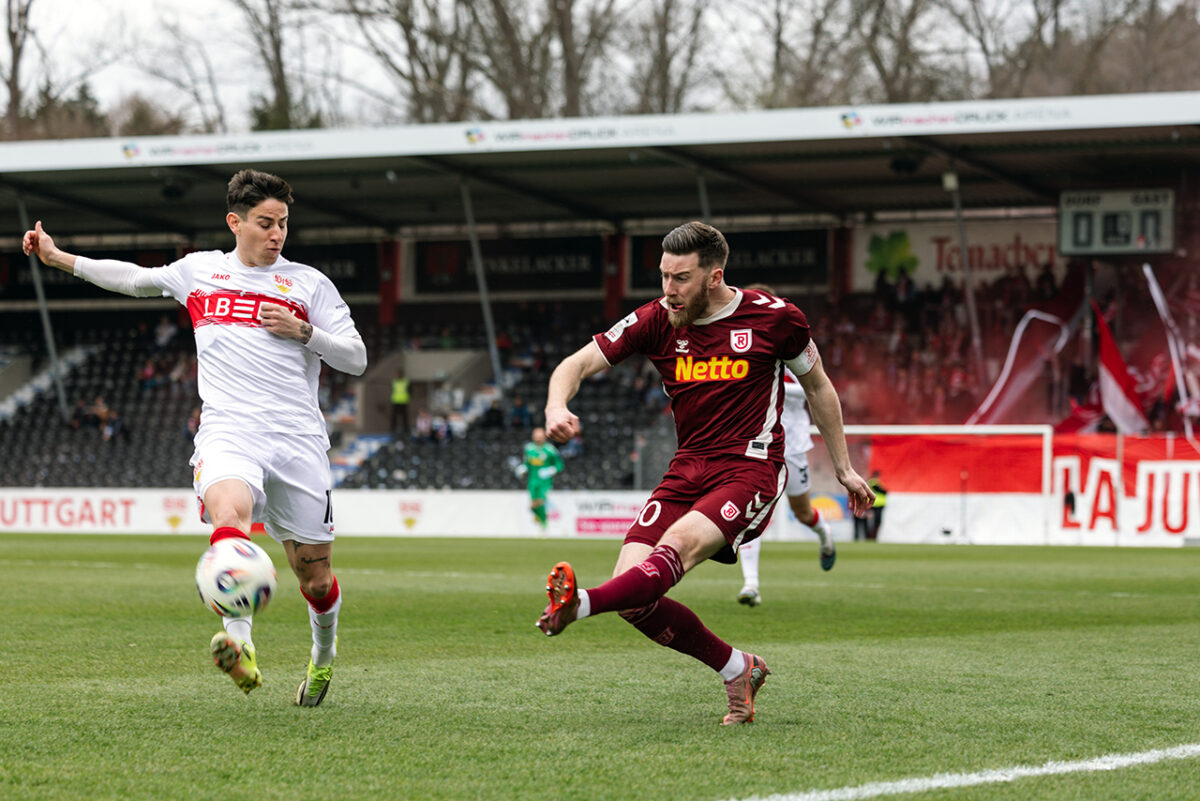 Jahn-Trainer Sascha Hildmann: „Wir haben uns viel vorgenommen, haben das zunächst auch ganz gut umgesetzt. Ich glaube, die erste halbe Stunde war Stuttgart sehr, sehr präsent. Das kennen wir, das ist eine super spielstarke Mannschaft mit großer individueller Klasse. Das sieht man auch am Marktwert der Spieler. Und trotzdem haben wir uns da freigeschwommen, haben dann auch mehr vom Spiel gehabt, hatten auch etwas längere Ballbesitzphasen und dann auch unsere Torchancen. Ich glaube, den Eckball kannst du auf jeden Fall reinmachen, den musst du vielleicht sogar reinmachen. Stuttgart hatte auch seine Möglichkeiten.