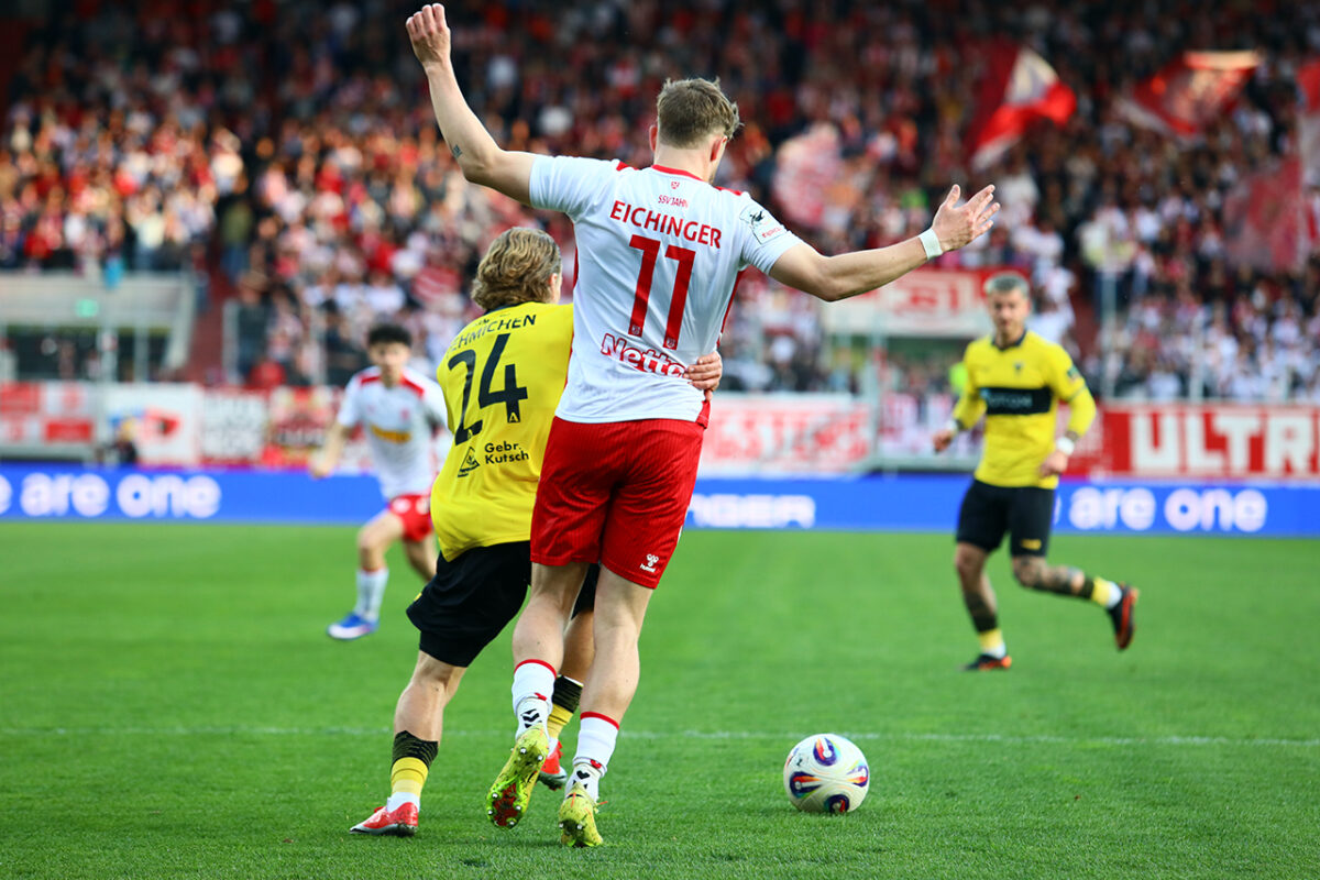 Glück für den Jahn: Der hochmotivierte Eric Hottmann köpft einen fein gezirkelten Freistoß von Adrian Fein zum 1:0 (34.) ein – der allererste Torabschluss. Kurz darauf bricht der Torschütze über rechts komplett durch, trifft aus spitzem Winkel nur den Pfosten (41.) – und der überraschte Noel Eichinger chippt den Abpraller aus rund 16 Metern über das leere Tor.
