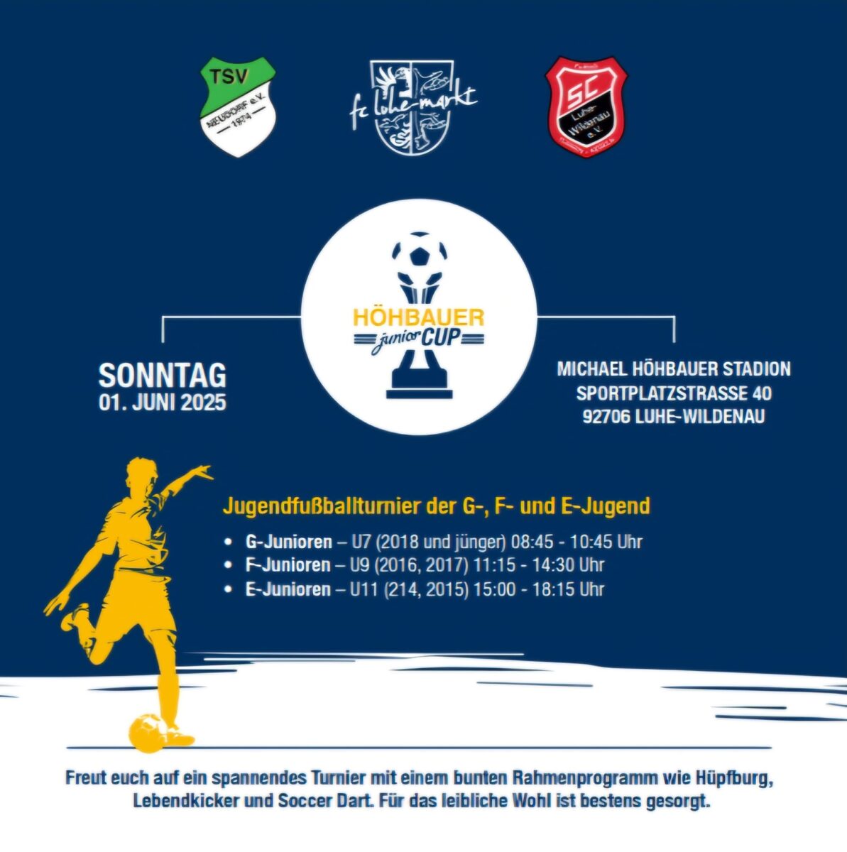 Am 1. Juni verwandelt sich das Gelände des SC Luhe-Wildenau in eine große Fußballarena für die Jugend: 40 Mannschaften von der G- bis zur E-Jugend treten beim Höhbauer Junior Cup gegeneinander an – ein echtes Mammutprojekt, das in dieser Form im Landkreis seinesgleichen sucht. Verantwortlich für dieses sportliche Großereignis zeichnen sich die drei örtlichen Vereine TSV Neudorf, FC Luhe-Markt und SC Luhe-Wildenau, die mit viel Engagement und Teamarbeit ein Turnier für die ganze Region auf die Beine gestellt haben.