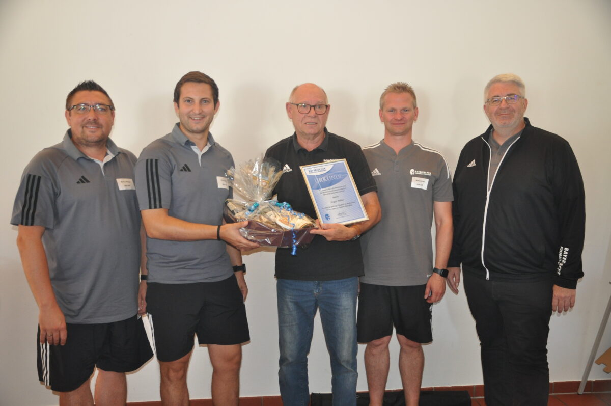 Der Bezirksliga-Lehrgang war auch ein passender Rahmen zur Verabschiedung von Jürgen Haller (Hirschau), der nach über einem Jahrzehnt als Beobachter auf Bezirksebene kürzertreten will. Obmann Markus Weigert lobte seine „große Zuverlässigkeit und Einsatzbereitschaft“ und überreichte eine Urkunde und einen Geschenkkorb. Als neue Coaches wurden Josef Karl (Gruppe Regensburg), Jan Dirrigl, Jonas Stöckl (beide Parsberg) und Marco Göhlich (Schwandorf) gewonnen.