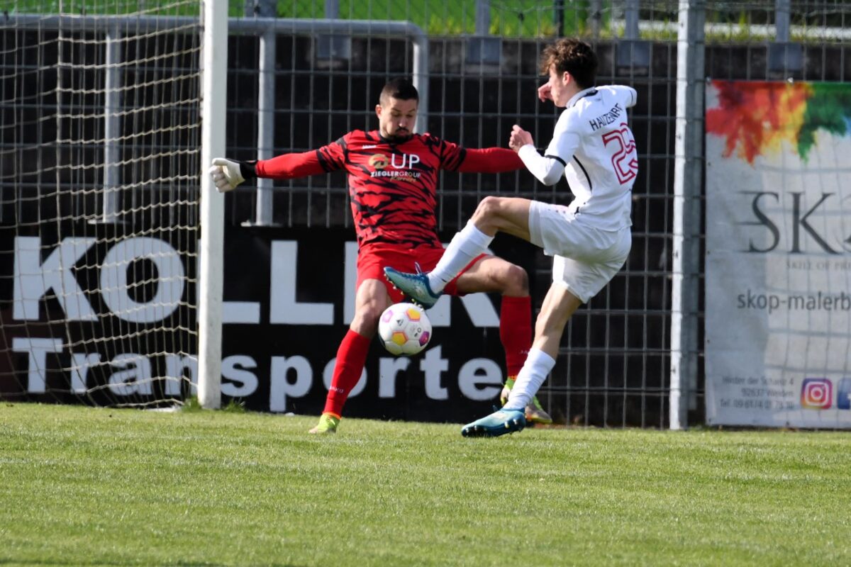 Weiden war von Beginn an gut im Spiel. „Wir waren klar überlegen, haben aber zu behäbig gespielt“, sagte Riester zur ersten Halbzeit. Gute Chancen vergaben Moritz Zeiter, Igli Cami, Bytomski und Josef Rodler. Die Gäste nutzten den ersten Fehler in der Weidener Abwehr, als Fabian Gastinger den mitgelaufenen Bastian Schmid bediente und nach Meinung von Schiedsrichter Christopher Schwarzmann von SpVgg SV-Keeper Eldin Becic zu Fall gebracht wurde. Tanzer verwandelte eiskalt zum 0:1.