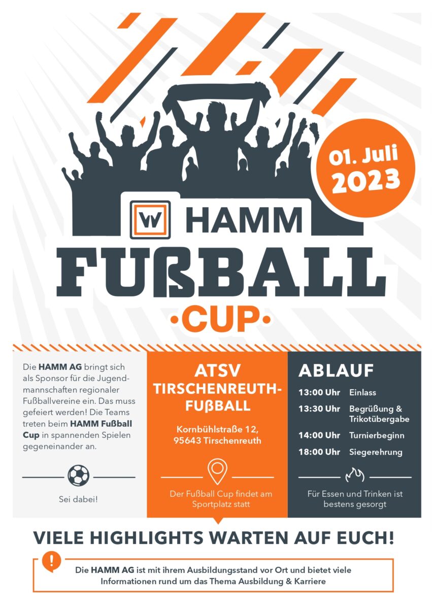 Beim Hamm Jugendcup auf dem Gelände des ATSV Tirschenreuth wird Hamm auch mit einem Ausbildungsstand vertreten sein. Grillstand, Getränke, Kaffee und Kuchen werden vom ATSV Tirschenreuth organisiert. Der Veranstalter erwartet circa 200 Zuschauer zu diesem Event und hat auch Landrat Roland Grillmeier und Bürgermeister Franz Stahl eingeladen.