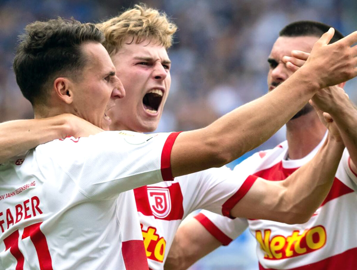 Letztlich reichen dem alles andere als berauschend aufspielenden Zweitligisten in Regensburg ein durchgesteckter Pass der Marke „Haching“ vom ersten Spieltag, den Lucas Schuler an Keeper Felix Gebhardt zum 1:0 vorbeischiebt (16.). Und gleich zwei frei stehende Blaue nach einer Standardsituation, die Jean Hugonet zur 2:0-Führung nutzt (59.).