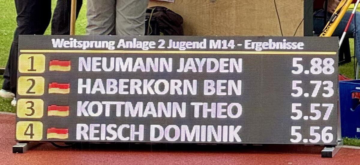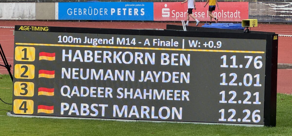Bereits eine Woche zuvor war Simon Risch (U18) bei den Bayerischen Meisterschaften in Hösbach im Einsatz. Im Vorlauf über 100 Meter zeigte er eine starke Leistung und kam mit 11,41 Sekunden nah an seine persönliche Bestzeit heran. Als Zweitplatzierter qualifizierte er sich sicher für das Finale. Dort verhinderten etwas ungünstigere Gegenwindverhältnisse eine weitere Steigerung – mit 11,55 Sekunden lief er im Finale auf einen beachtlichen sechsten Platz – ein Ergebnis, das seine gute Form einmal mehr bestätigte.
