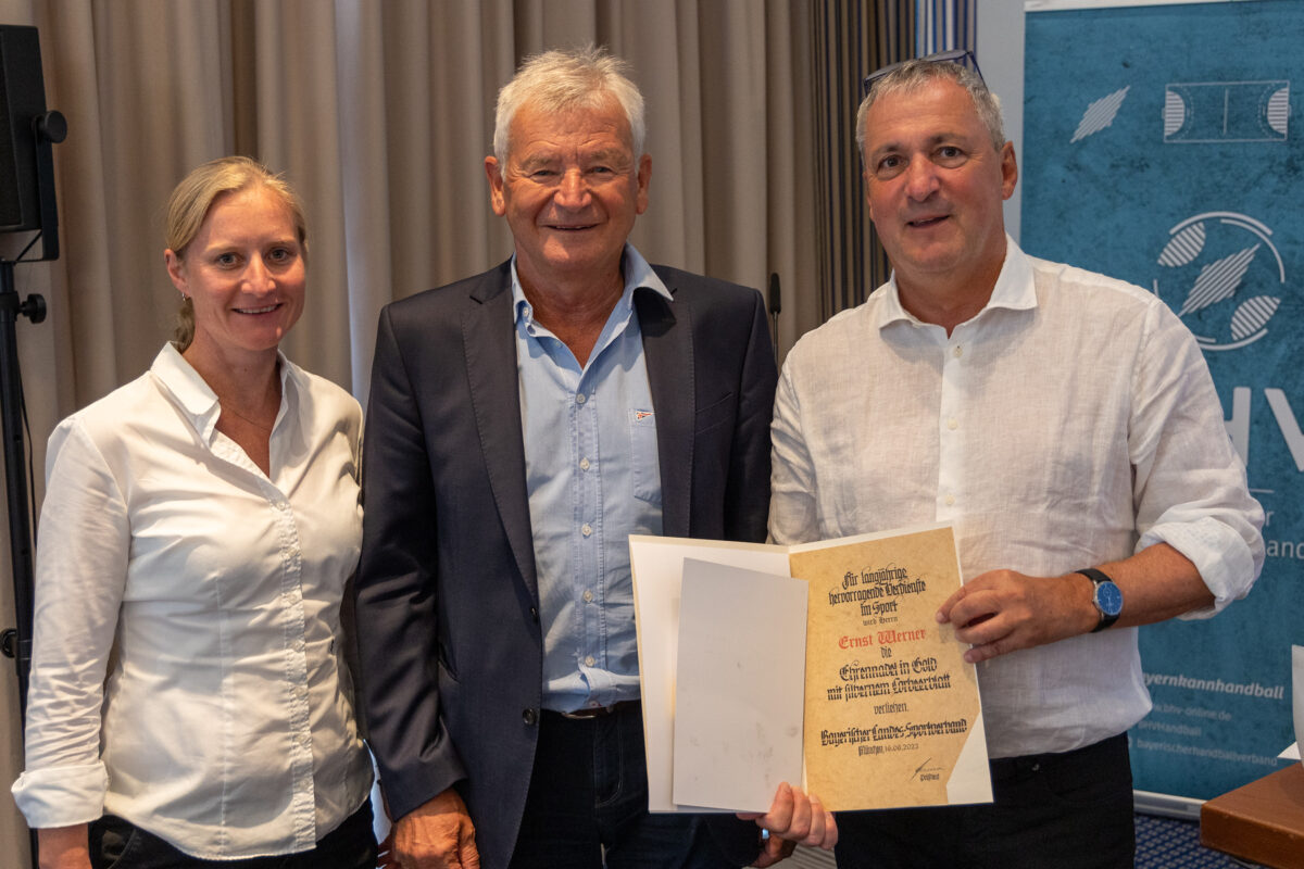 Der Bayerische Handball-Verband (BHV) überreichte Ernst Werner nun beim Verbandstag in Bad Brückenau die Ehrennadel in Gold mit silbernem Lorbeerblatt und ernannte ihn zum Ehrenmitglied. In seiner zwöfjährigen Tätigkeit als Vizepräsident Bildung im BHV lag ihm besonders das Kinder- und Jugendzertifikat am Herzen. Ein gutes Training, egal in welcher Sportart, wird immer mit Interesse und Zulauf von Spielerinnen und Spielern honoriert.