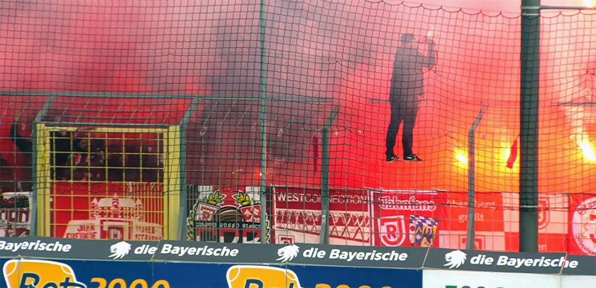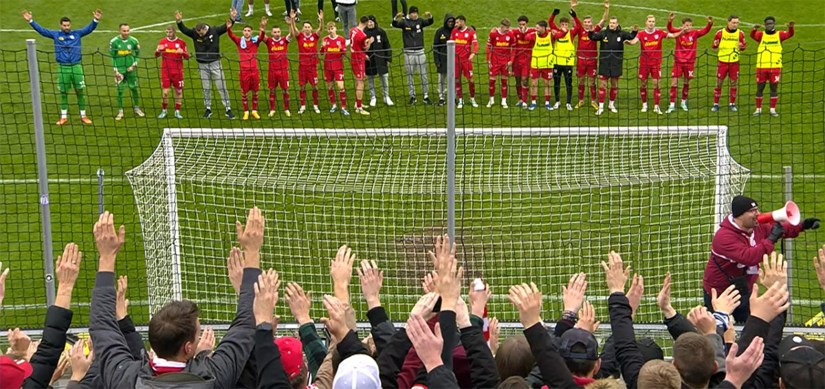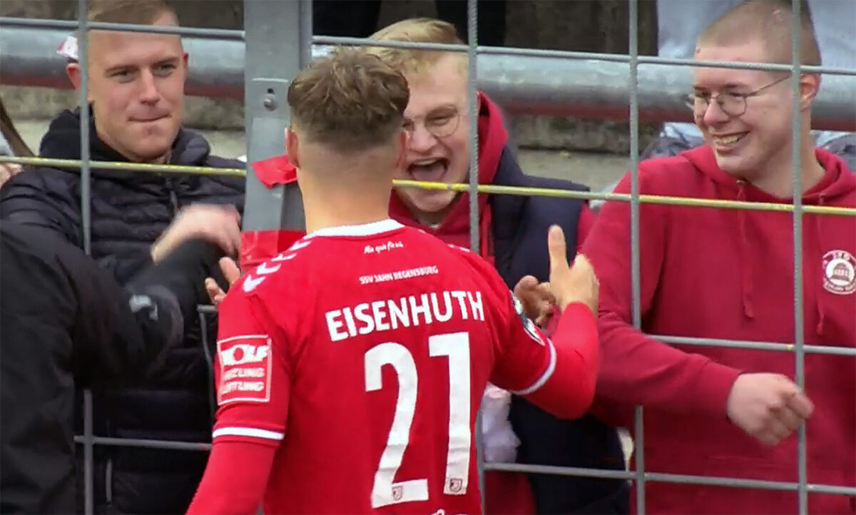 Was folgt, ist die pure Emotion, auf die wir heute sehr, sehr lange warten mussten: Jahn-Spieler außer Rand und Band fallen übereinander her, Fans, die aus dem Häuschen das späte Glück feiern – die Spielertraube reißt dabei unfreiwillig die Bande ein, eine moderate Revanche für den Sitzschalen- und Stangenwurf von 2017.