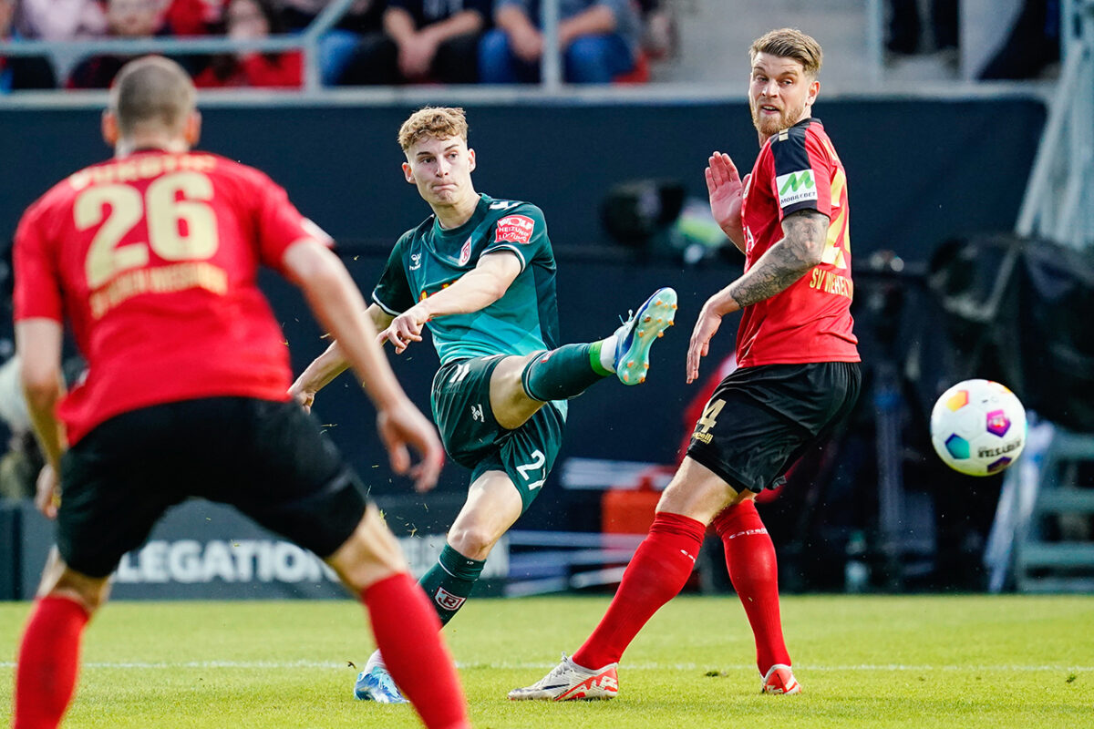 Die Schlüsselszene des Spiels dann Sekunden vor dem Halbzeitpfiff: Das erste Mal startet Konrad Faber zu einem seiner gefürchteten Speedy-Gonzalez-Sprints auf der rechten Außenbahn, bringt die Flanke exakt auf Dominik Kother, der die Kugel per Köpfchen versenkt, 0:1 (46.), Tiefschlag für die Gastgeber mit dem Pausenpfiff.