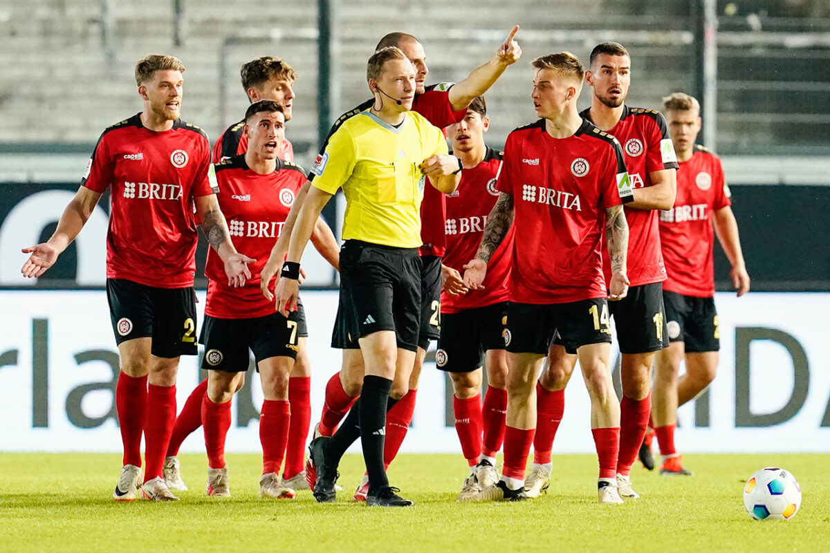 Und es kommt noch schlimmer für den 16. der Zweiten Liga: Fast mit dem Wiederanpfiff die große Ausgleichschance für Wiesbaden – bevor sich Ivan Prtajin den Abpraller von Jahn-Keeper Felix Gebhardt schnappen kann, bringt ihn ein Schubser von Oscar Schönfelder aus dem Gleichgewicht. Während alle auf den Elferpfiff warten oder zumindest die Überprüfung der Szene im Kölner Keller, lässt der Stuttgarter Bundesliga-Referee Martin Petersen die Partie weiterlaufen.