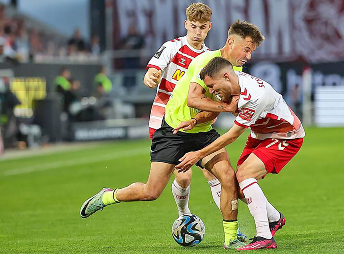 Im Gegenteil: das aggressive Pressing des Dritten der Dritten Liga wird belohnt: Robin Ziegele schmeißt sich im Mittelfeld in einen Zweikampf, schont weder Ball noch das eigene Schienbein – der souveräne Schiedsrichter Tobias Reichel erkennt auf Vorteil, lässt die Szene weiterlaufen – wofür sich anschließend Konrad Faber, zu dessen Verwunderung, so überschwänglich bedankt, dass der sich bedrängt fühlt.