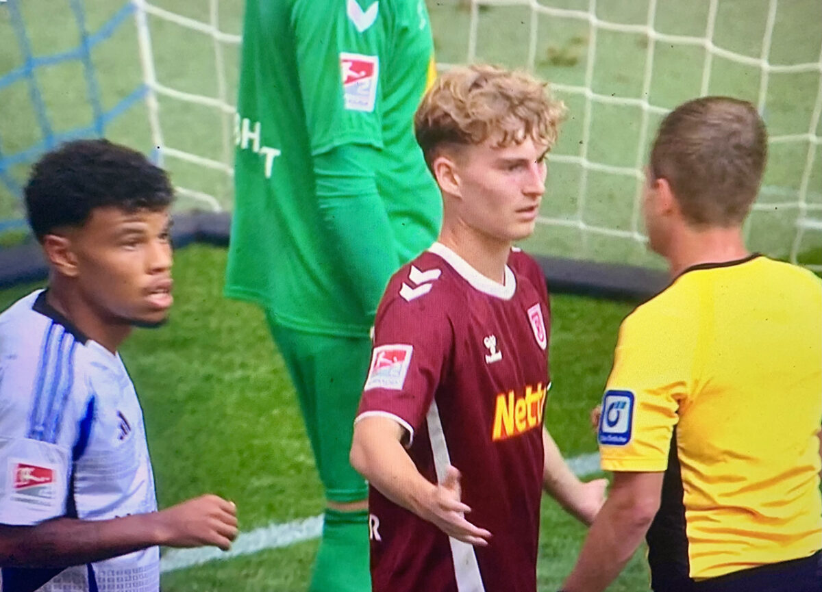 Man hat die Warnung von Coach Enochs noch im Ohr: „Wir müssen von Anfang an wach sein“, hatte er an sein Team appelliert, das sich auch gegen Fürth viel zu früh den ersten Gegentreffer eingefangen hat. Und was machen die Oberpfälzer in der ersten Minute: Ballverlust im Mittelfeld, der 19-jährige Fabio Baldé, der es aus der Regionalliga in den Profikader geschafft hat, ist von Robin Ziegele nicht ansatzweise einzufangen, Flanke in die Mitte – Ransdorf Königsdorffer, von HSV-Trainer Steffen Baumgart in seiner PK über den Klee gelobt, nickt völlig unbehindert ein, 1:0 (1.).