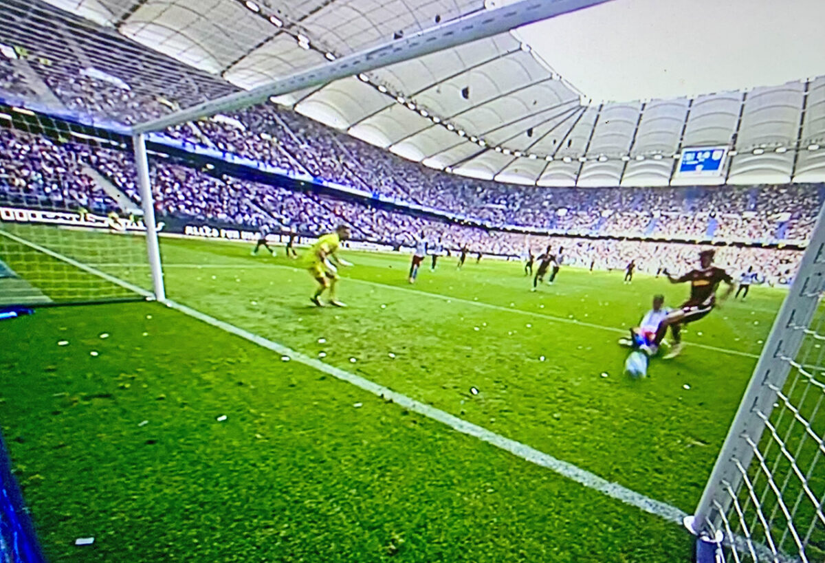 Und doch: Ehe Hamburg nachlegen kann, kommt Regensburg wie aus dem Nichts zur ersten Chance. Und was für einer. HSV-Kapitän Sebastian Schonlaus Fehlpass landet bei Christian Viet, der Kai Pröger rechts steil schickt, flache Hereingabe, am zweiten Pfosten kommt Dominik Kother um eine Fußspitze früher als Dennis Hadzikadunic an den Ball – die Kugel rollt über die Linie, 1:1 (7.). Denkt man, da auch Schiri Robin Braun, Virtuose der Gelben Karten, keine Einwände erhebt. Doch der Keller hat noch ein Wörtchen mitzureden. Weil sich Köln bei der Kalibrierung offenbar unsicher ist, überlässt man Braun die Entscheidung, der nach Augenschein Kother einen Millimeter weiter vorne sieht – kein Treffer.