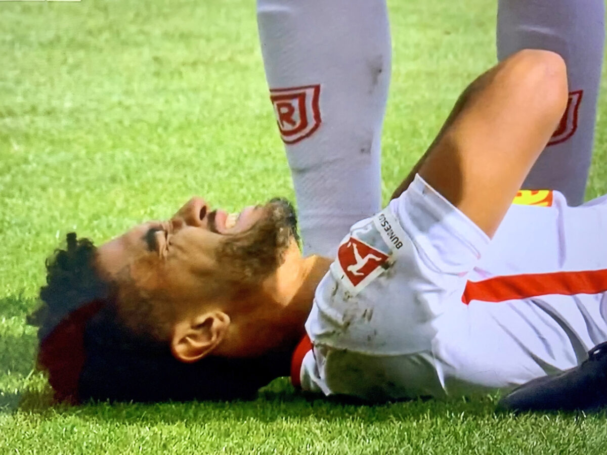Die Oberpfälzer überlassen nach wie vor den Pfälzern über weite Strecke den Ball, machen aber das Zentrum dicht, sodass die Gäste kaum Luft zum Kombinieren bekommen. Jetzt macht man sich langsam ein wenig Sorgen um Hein, der noch einmal Tachie zu Fall bringt – nicht noch ein Platzverweis wie bei Mansour Ouro-Tagbas erster Aktion in Berlin, noch dazu auf der dann vakanten Linksverteidigerposition (22.).