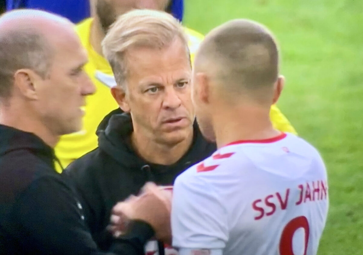 Das wär’s jetzt noch gewesen: Klement verdaddelt die Kugel im Mittelfeld, Jahn-Kapitän Andi Geipl wagt vom Mittelkreis den versuchten Geniestreich, doch Keeper Krahl lässt sich nicht veralbern, eilt ohne Hast zurück und fängt den Weitheber mit breitem Grinsen unaufgeregt ab. (83.). Kühlwetter drängelt sich in den Strafraum, fällt im Duell mit Heuer zu leicht, kein Elfer – stattdessen eine fruchtlose Ecke (85.).