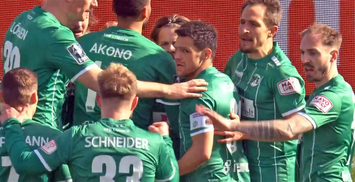 Weil das aber nicht zählt, tut der erste Lübecker Torschuss so richtig weh: Der Ex-Regensburger Jan-Marc Schneider schirmt die Kugel am Sechzehner mit dem Rücken zum Kasten ab, Florian Ballas versucht vergeblich die Lücke zu schließen, Schneider reicht weiter auf Robin Velasco, der abzieht und den Ball links unten versenkt: die Neuauflage des Ingolstädter Führungstreffers vor einer Woche, das 1:0 aus dem Nichts (12.). Zuvor hatte Bene Saller den eigentlich schon ergatterten Ball im Mittelfeld wieder abgegeben.