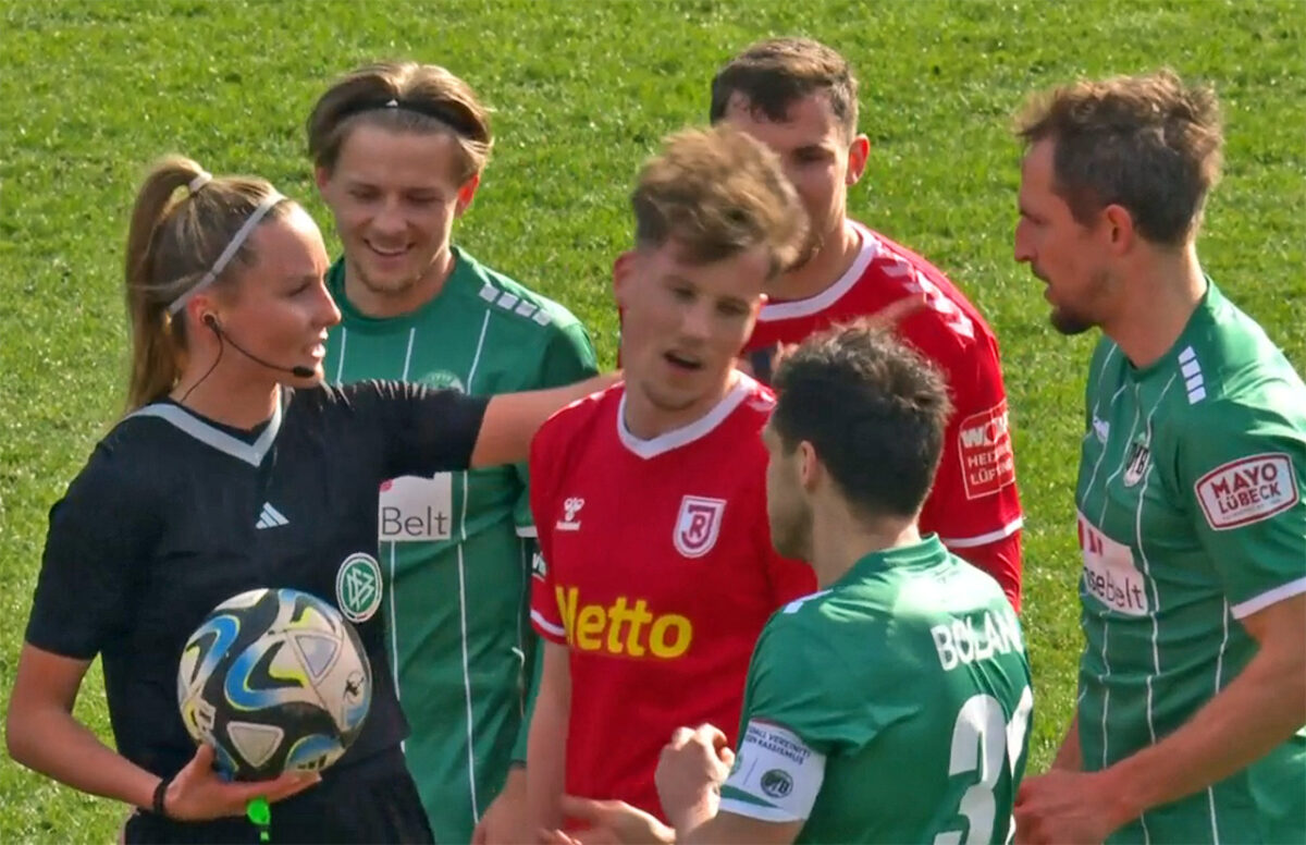 Nur einmal muss Lübeck tatsächlich das Glück des Tüchtigen bemühen: Niklas Kastenhofer trifft Oscar Schönfelder am Elfmeterpunkt klar am Knie. Weil aber der Ball schon weg ist, ist der Blick von Schiedsrichterin Fabienne Michel schon zur nächsten Situation gewandert (33.) – wohl auch zum Glück der Uefa-Women-Nation’s-League-Referee, die nach dem Spiel mit Regenschirm in die Kabinen geführt werden muss. Trotz einiger strittiger Szenen, nicht gerade Gentlemen-like vom norddeutschen Publikum, das doch lieber die drei Punkte feiern sollte.