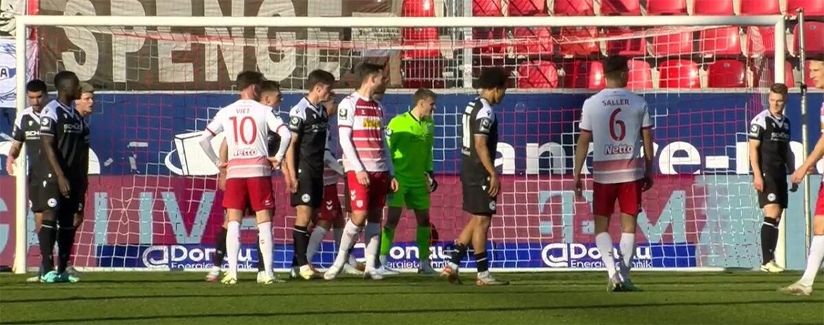 Wieder ein langer Ball auf Ganaus, der setzt sich stark durch und zieht aus 8 Metern aus spitzem Winkel ab, Außennetz (40.). Aber Bielefeld hat sich noch lange nicht aufgegeben, versucht jetzt den Anschlusstreffer noch vor der Pause zu erzwingen, Momuluh geht an Saller vorbei, nimmt dankend dessen Bein an und hebt ab – der Schiri zeigt nach kurzem Zögern auf den Punkt. Jahn-Keeper Alex Weidinger macht sich ganz breit, Nassim Boujellab setzt die Kugel an die Oberkante der Latte (43.)!