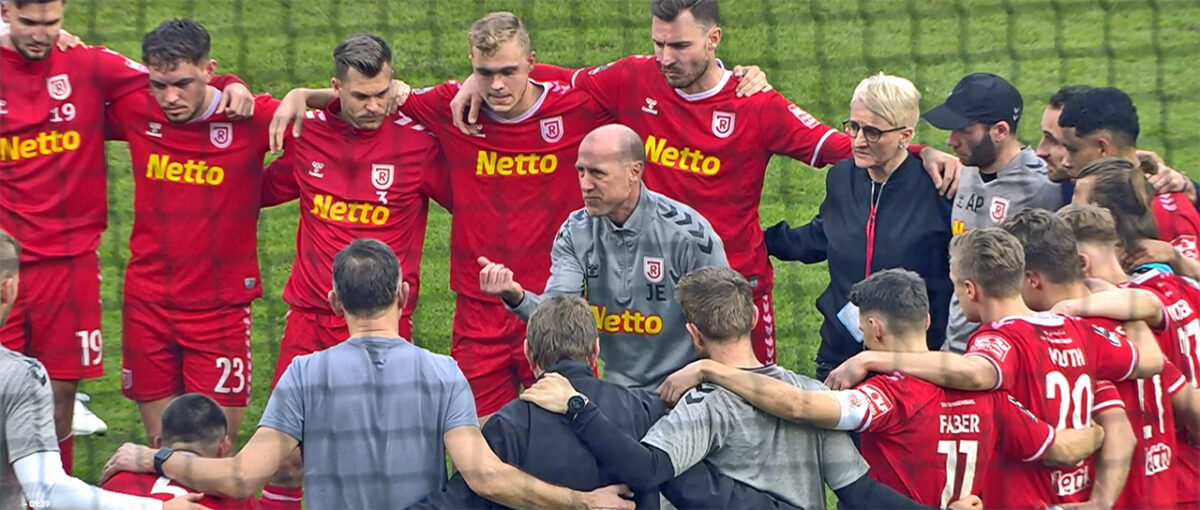 Die Art und Weise, wie sich die Regensburger in zehn Minuten die Butter vom Brot nehmen lassen, erinnert fatal an das 3:6-Debakel von Sandhausen. Und als ginge es nicht noch schlimmer: Abgesehen von Ganaus überaus optimistischem Schussversuch aus spitzestem Winkel (50.) strahlt der Spitzenreiter weniger Gefahr aus als eine Weinbergschnecke. Insofern ist das finale 3:1 von Joker Kobylanski, der zuvor schon einen Freistoß ans Lattenkreuz setzte, zu verschmerzen – den Willen zur Wende kann man am ehesten noch beim eingewechselten Youngster Max Meyer erkennen.