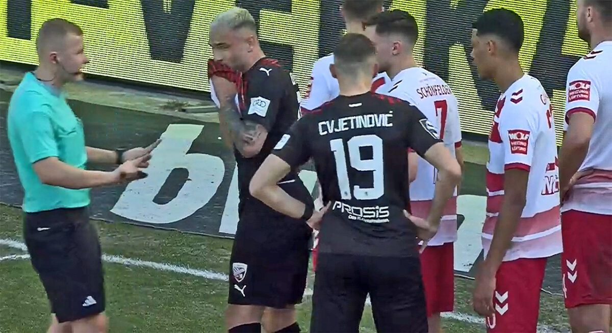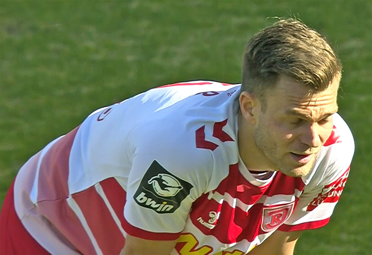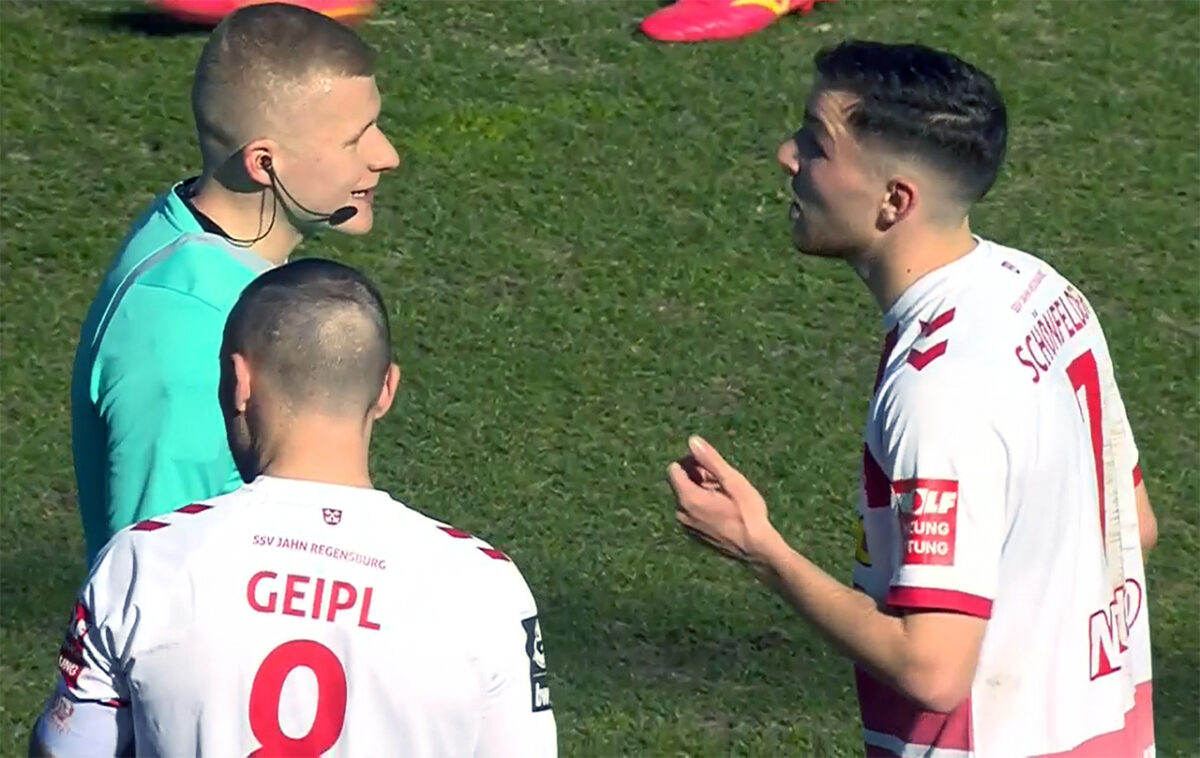 Bei unserem Führungstreffer waren wir gut auf den zweiten Ball, den haut Kayo Vollspann in die kurze Ecke rein, er hat wie ein Blitz unten eingeschlagen, gut für den Jungen. Wegen seiner Gelben Karte und ein, zwei Foulspielen danach mussten wir in der Halbzeit reagieren, damit der Schiedsrichter nicht am Ende einen von uns vom Platz stellt. Bei der abgepfiffenen Szene zuvor, das war ein normaler Zweikampf, der Spieler verschätzt sich, erwischt den Ball nicht gscheit, Bryang geht hinten durch, und da fällt der Spieler von Regensburg eigentlich in Kayo rein. Also, das hat der Schiedsrichter nicht gut gesehen.