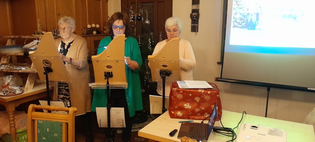 Elisabeth Oesterreicher, Susanne Busch und Elfriede Wagner sorgten mit ihren Veeh-Harfen für die musikalische Umrahmung der Feier. Nach dem Essen begann der besinnliche Teil mit einer von Birgit Weinhold vorgetragenen lustigen Weihnachtsgeschichte „Nikolaus auf Abwegen. Ein Sack voller Überraschungen“. Hier hatte der Nikolaus aus Versehen statt Naschereien für die Kinder die Gemüseeinkäufe der Ehefrau in den Sack gepackt.