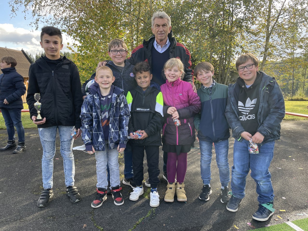 Beim Termin mit dabei Jan-Ikone Hans Mayer, der sich der jungen Torschützen annahm und sie im Spiel gegen den ehemaligen deutschen Fußballtrainer unterstützte.