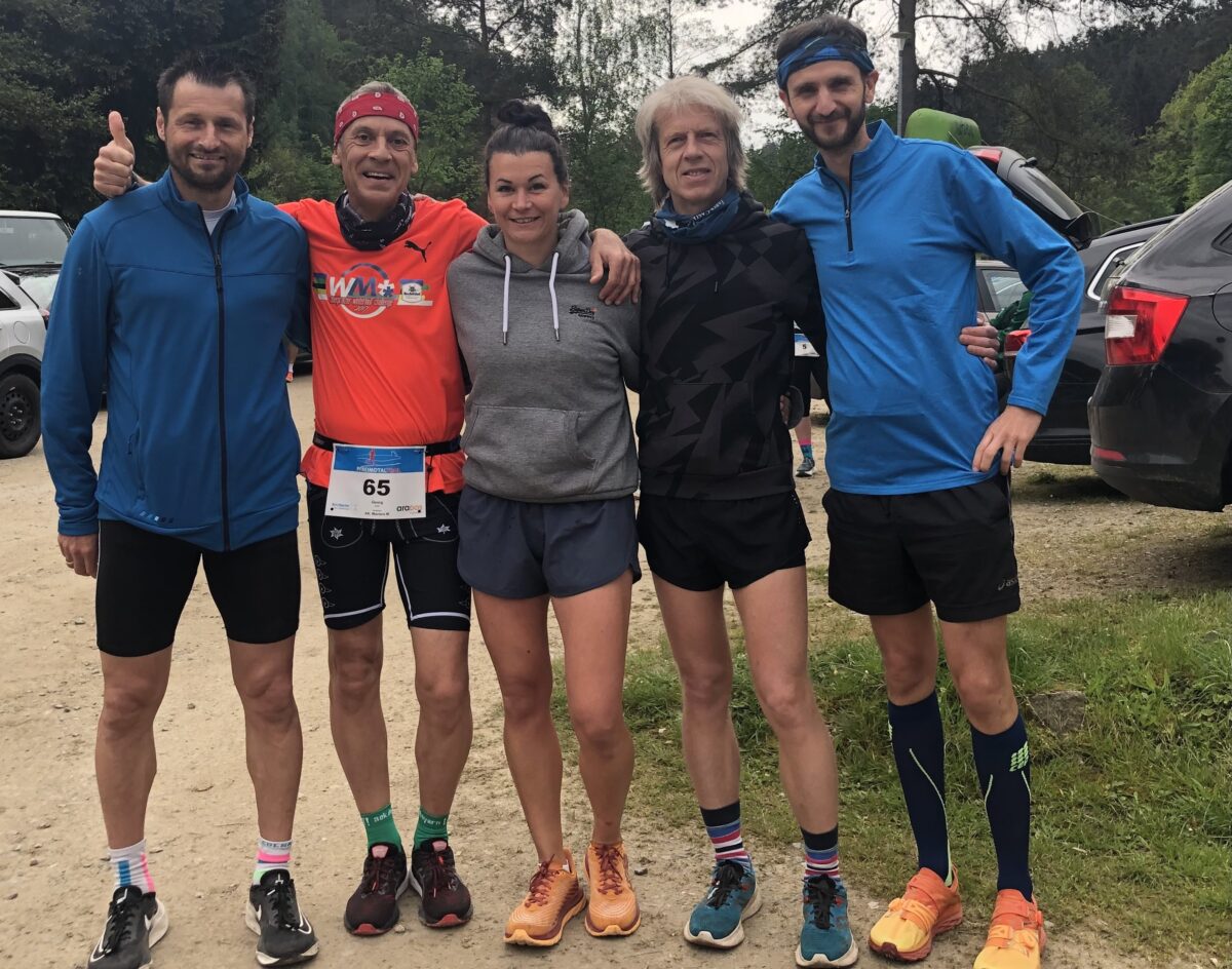 Am Sonntag folgte mit dem Pfreimdtaltrail-Halbmarathon gleich die nächste Herausforderung für Georg Koller (TB Weiden) und seine Laufkameradinnen und -kameraden Birgit Kotzbauer (DJK Weiden), Markus Schreiner (SV Altenstadt/Voh.), Michael Eckl (TB Weiden) und Peter Fischer (DJK Weiden). Auf dem 21 Kilometer langen Trail mussten circa 600 Höhenmeter absolviert werden. Die Strecke führte von TSV Trausnitz auf Forst- und Wiesenwegen zum Hochspeicher, über die Tanzmühle ins Pfreimdtal und zur Ödmühle zum Stausee. Auf dem Rückweg überquerte man die Staumauer, ehe es zurück ins Ziel am Trausnitzer Sportplatz ging.