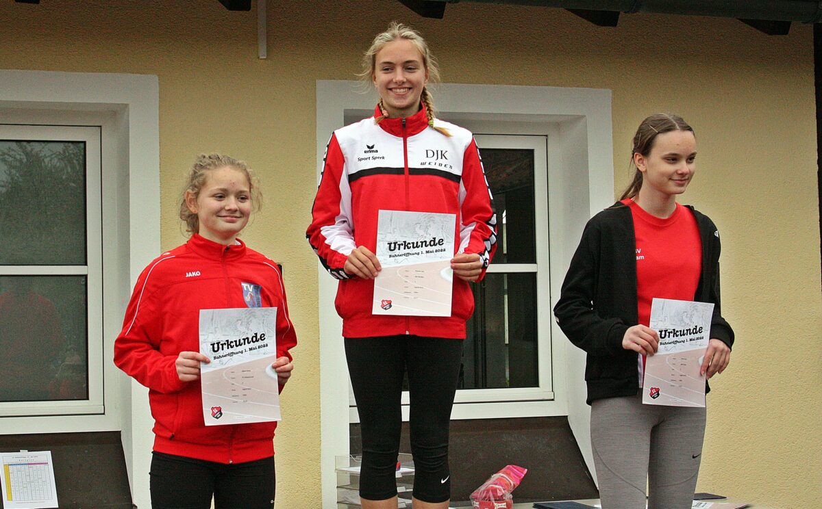 Neben vielen weiteren Sportlerinnen und Sportler, die zu Beginn des Leichtathletikjahres schon gute Leistungen boten, präsentierte sich vor allem Lea Kreuzer von der DJK Weiden in Topform. Sie stand insgesamt dreimal ganz oben auf dem Siegerpodest. Besonders zu erwähnen sind die 13,17 Sekunden über die 100 Meter, die eine neue persönliche Bestleistung bedeuten.