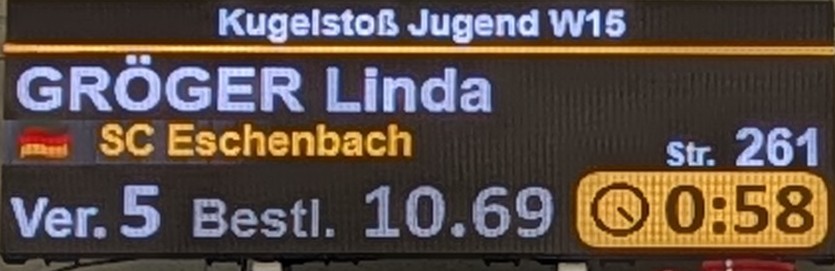 Trotz anfänglicher Nervosität durch die imposante Kulisse des Olympiastützpunkts und der damit verbundenen Atmosphäre, gelang es Linda Gröger, ihre Leistung zu steigern und in allen drei Disziplinen, an denen sie teilnahm, neue persönliche Bestleistungen aufzustellen. Beim Kugelstoßen erreichte sie mit einer Weite von 10,69 Metern den siebten Platz in ganz Bayern. Eine weitere Bestleistung zeigte sie im 60m Hürdensprint, den sie mit einer Zeit von 10,16 Sekunden abschloss und sich damit den 21. Platz sicherte.