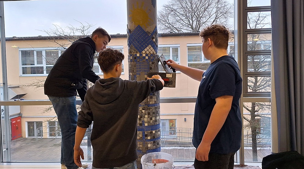 Acht motivierte Schüler der M8 tauschten für zwei Tage die gewohnten Schulbücher gegen Werkzeuge und Fliesen ein. Unter der fachkundigen Anleitung der Firma Gradl aus Grafenwöhr durften sie die Kunst des Fliesenlegens praktisch erleben. Die Jugendlichen verschönerten mit viel Engagement und Kreativität drei Säulen in der Aula der Schule. Dabei bewiesen sie handwerkliches Geschick und Vorstellungsvermögen.