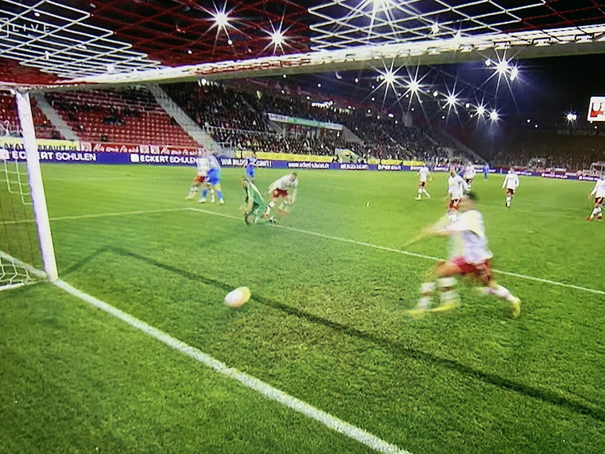 Gegen die auf vier Positionen veränderte Eintracht aus Braunschweig – im Tor statt Fejzic der junge Ron-Thorben Hoffmann, sowie Michael Schultz, Maurice Multhaupt und Fabio Kaufmann für Medina (Mittelhandbruch), Marx (Bank) und Ujah startet der SSV Jahn ähnlich schwungvoll wie bei den Hanseaten. Die logische Folge: Nach Joshua Mees‘ Pfostenschuss aus der Drehung, schiebt Charalambos Makridis zum 1:0 (11.) ein – ein Führungstreffer, auf dessen Bestätigung aus der Karnevalhochburg die Fans natürlich wieder minutenlang warten durften.