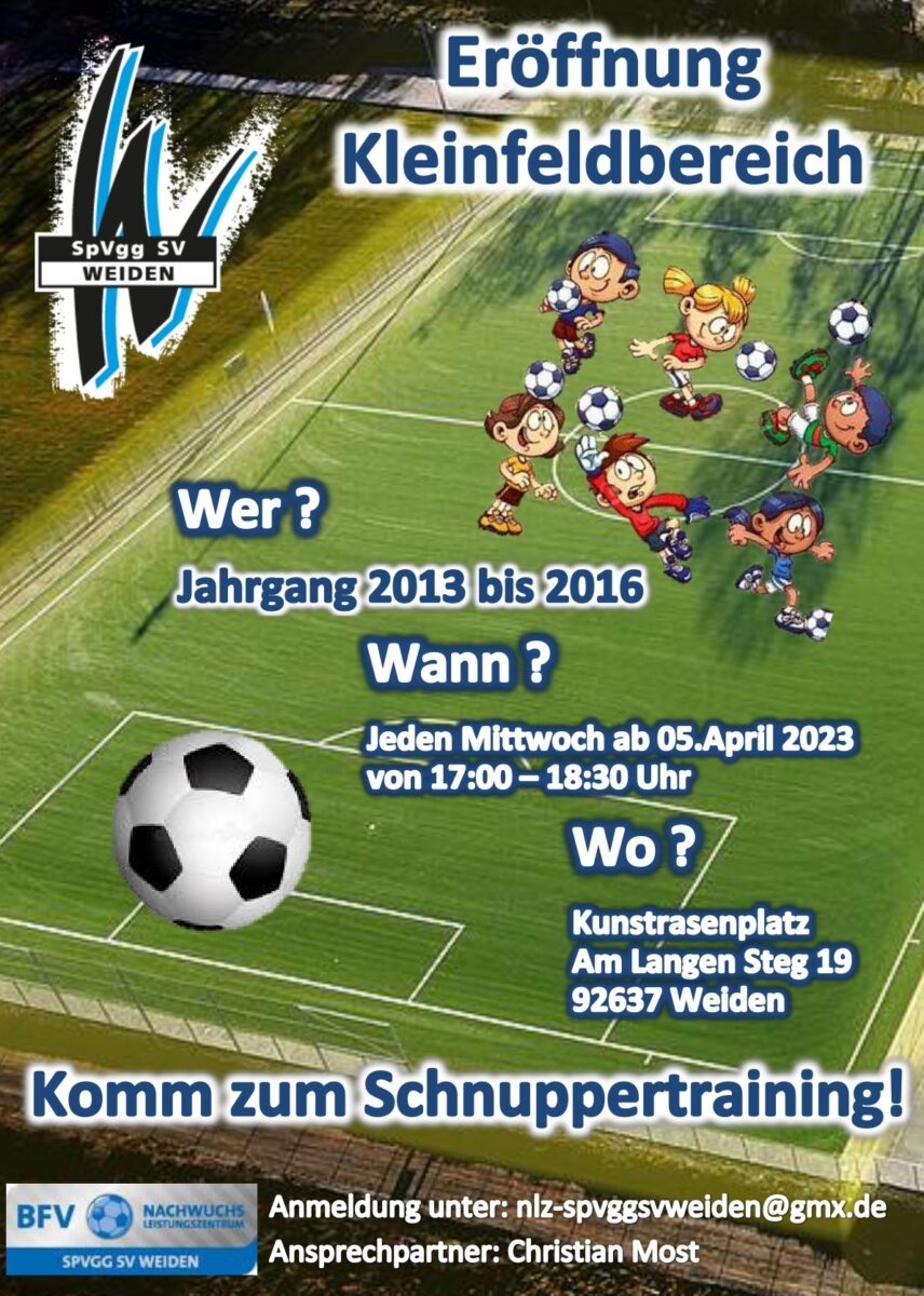 „Wichtig ist es uns, die Spieler oder Spielerinnen frühzeitig an den Verein zu binden und damit die Kaderplanung in den älteren Jahrgängen zu verbessern.“ Gestartet wird am Mittwoch, 5. April, 17 Uhr. „Es findet jede Woche ein Schnuppertraining für alle Kinder der Jahrgänge 2013 bis 2016 statt. Interessierte Kinder und Eltern können hier ganz unverbindlich die SpVgg SV und ihr Vereinsgelände kennenlernen“, erklärt Most. Eine Anmeldung unter nlz-spvggsvweiden@gmx.de ist wünschenswert.