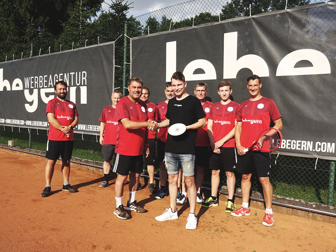 Auch eine große Tennisblende mit dem Logo der Werbeagentur hängt schon seit einiger Zeit als Sicht- und Windschutz auf dem Platz „An der Rundschleif“. Vorstand sowie Spieler bedankten sich bei der offiziellen Übergabe der Trikots bei ihrem Sponsor und freuen sich, zukünftig nicht nur sportlich sondern auch optisch als geschlossene Einheit auftreten zu dürfen.