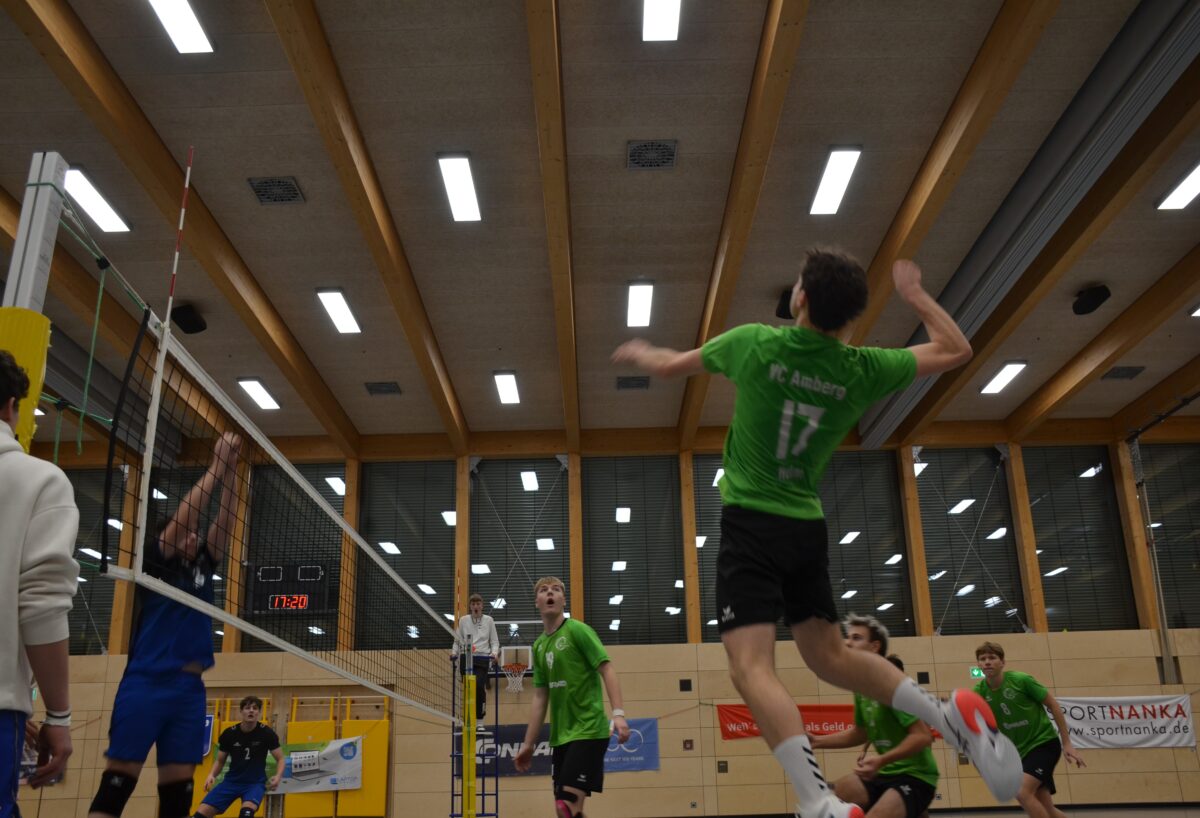 Nach einem 2:0-Erfolg von TB Weiden über den SC Memmelsdorf stand Platz sieben für die Oberpfälzer fest. In zwei Sätzen holte sich TV/DJK Hammelburg den fünften Platz gegen TSV Zirndorf II. Im kleinen Finale überraschte der SV Schwaig den ATSV Oberkotzau mit 15:9 im Tiebreak und holte sich das Ticket für die „Bayerische“. Im Finale am Sonntagnachmittag sahen die Fans ein tolles Duell zwischen den Rivalen aus Zirndorf und Amberg. Deren Kapitän Sebastian Helm, Zuspieler Ben Kühnert und der wieder genesene Paul Roggenhofer führten die kompakte Amberger Mannschaft zum 25:23- und 25:20-Sieg. Bei der Bayerischen Meisterschaft am 1. März treffen die Amberger Talente auf den TSV Herrsching und den SV Schwaig, in der anderen Gruppe spielen TSV Zirndorf, TSV Unterhaching II und SV Lohhof um die Fahrkarte zur Deutschen Meisterschaft.