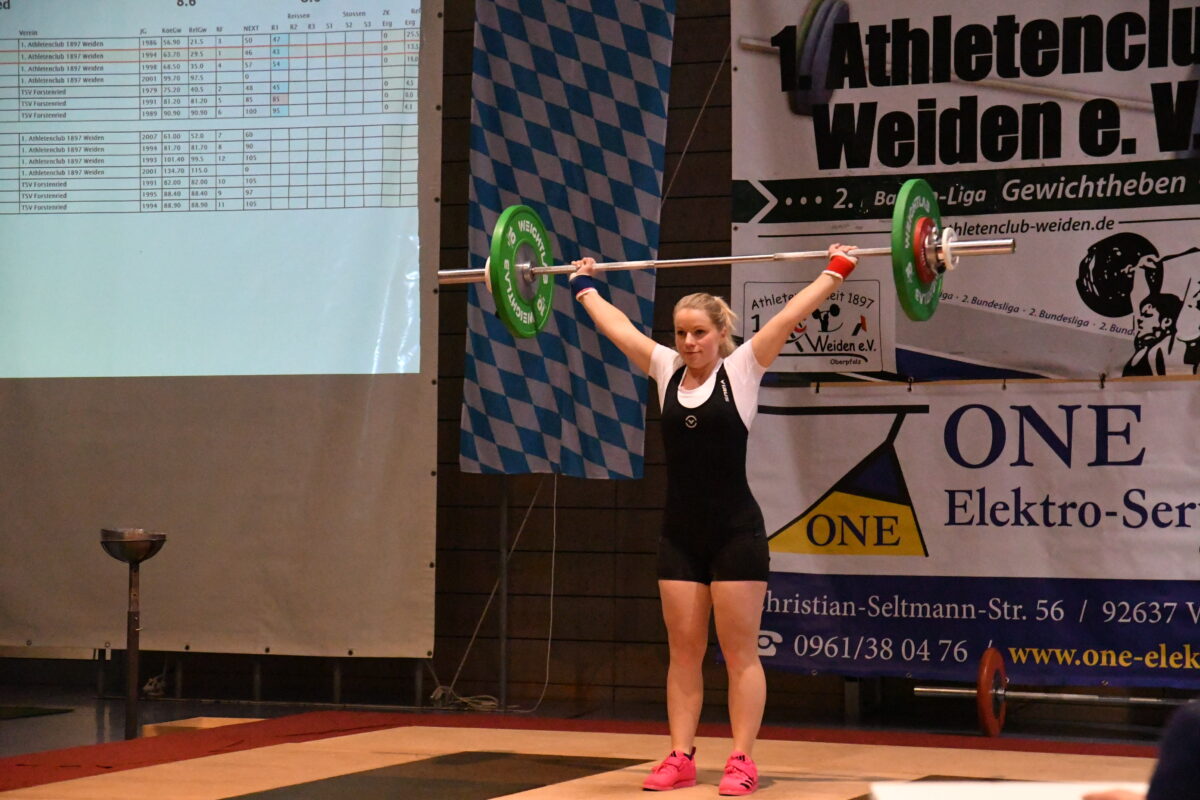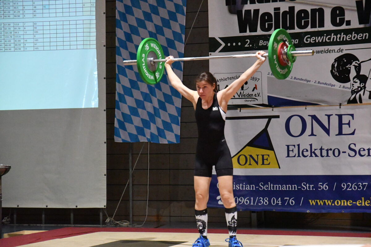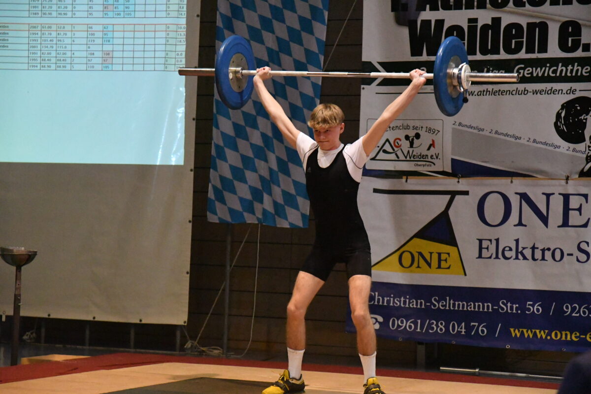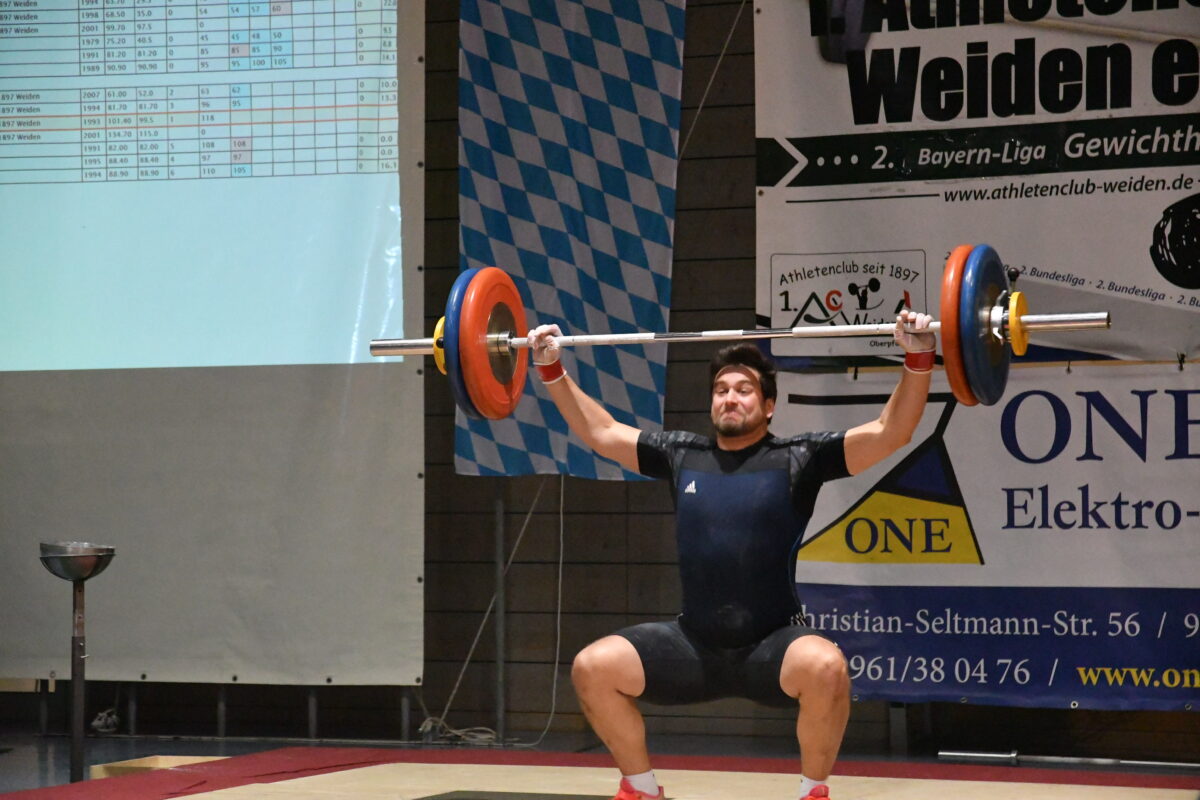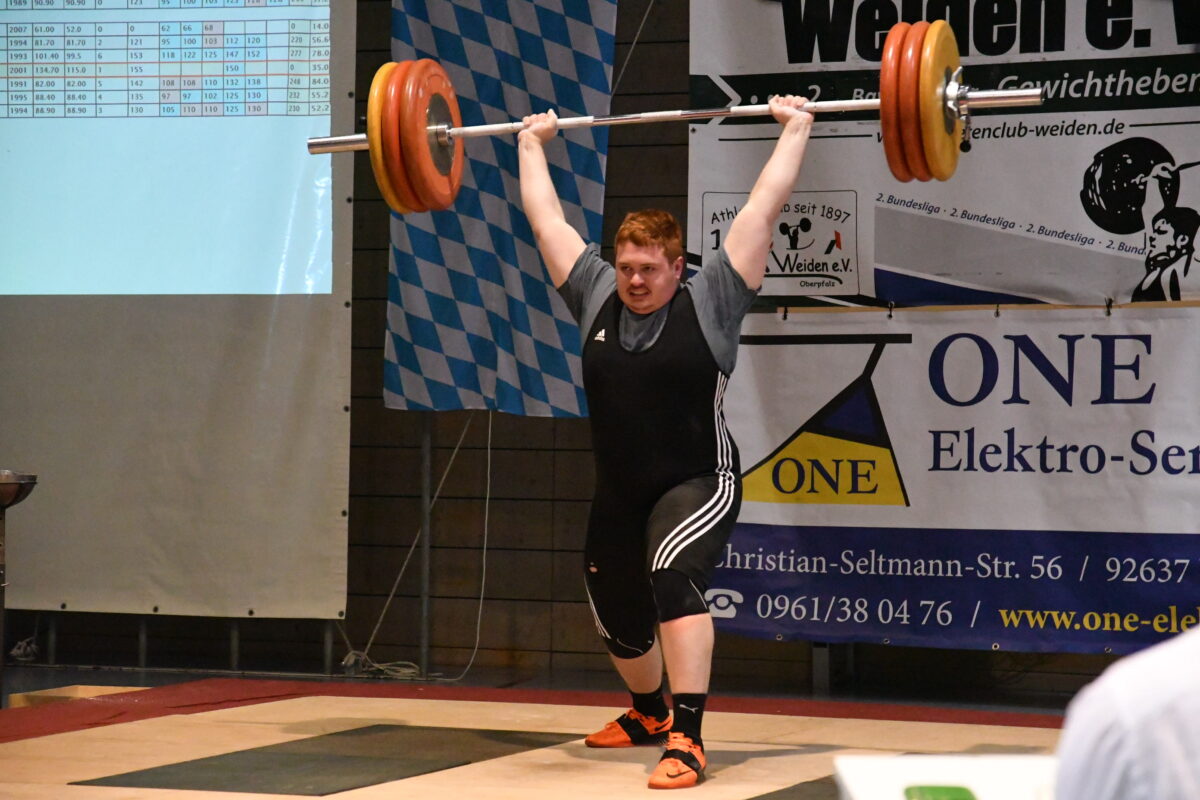 Beim Reißen traten Simone Schemmel mit 16,5 Relativpunkten an, Josephine Köppen hob 50 Kilogramm, Kerstin Schemmel hob 57 Kilogramm, Johannes Popel 100 Kilogramm, Konstantin Wolf als Jüngster erreichte 14 Relativpunkte mit 66 Kilogramm und Alexander Narr stemmte 125 Kilo. Am Ende lag der AC-Weiden im Reißen vor Forstenried mit 124,8 zu 90,1 Relativpunkten.