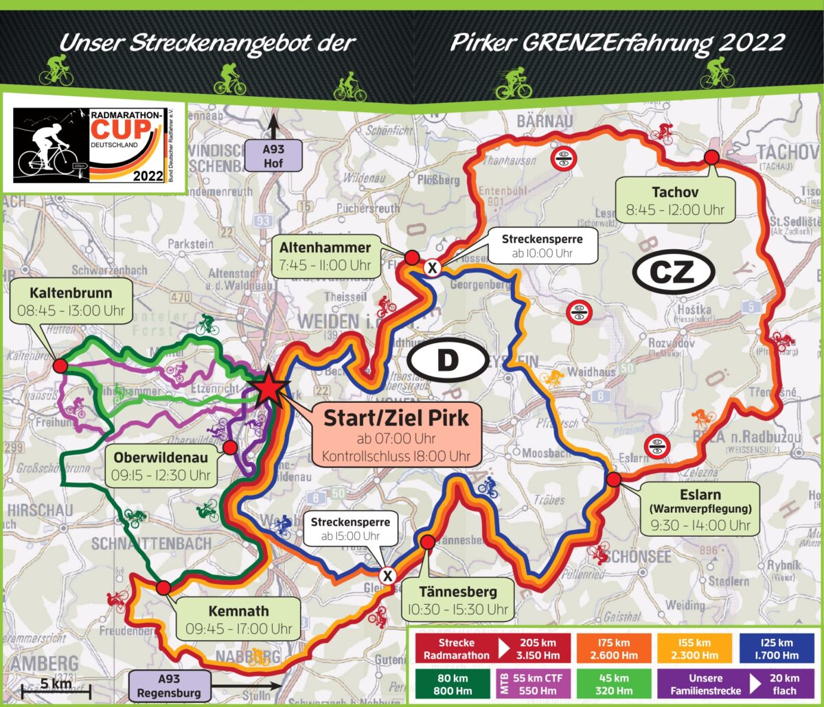 Der neue Name des Radmarathons sei bewusst mehrdeutig gewählt, erzählte Radlbeck. Zum einen überquere man die Grenze nach Tschechien und zum anderen werden einige Teilnehmer sicher an und über ihre körperlichen Grenzen gehen. Kein Wunder bei diesem Streckenangebot, das kaum Wünsche offen lässt: Von der 20 Kilometer kurzen Familienstrecke über die schon recht anspruchsvolle 55-km-Mountainbiketour bis hin zum Gipfel der Gefühle aller Radel-Enthusiasten, dem 205-km-Rundkurs mit sage und schreibe 3150 zu überwindenden Höhenmetern (Hm).